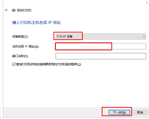 设备类型选择"TCP/IP"设备,填写打印机IP地址,点击下一步。
