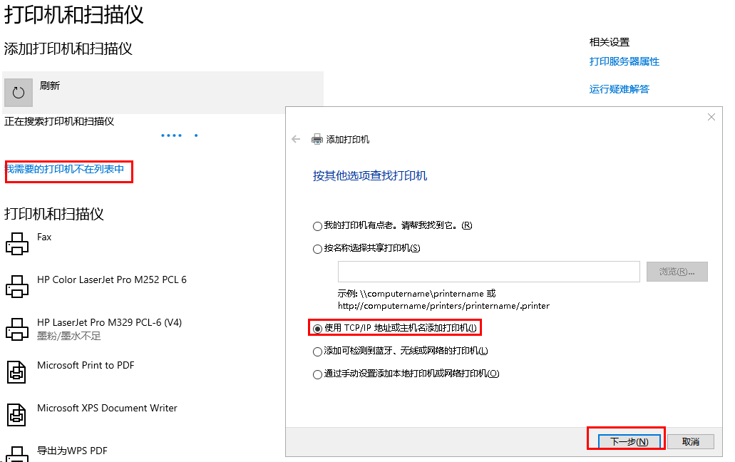 点选"我需要的打印机不在列表中",出现添加打印机页面。