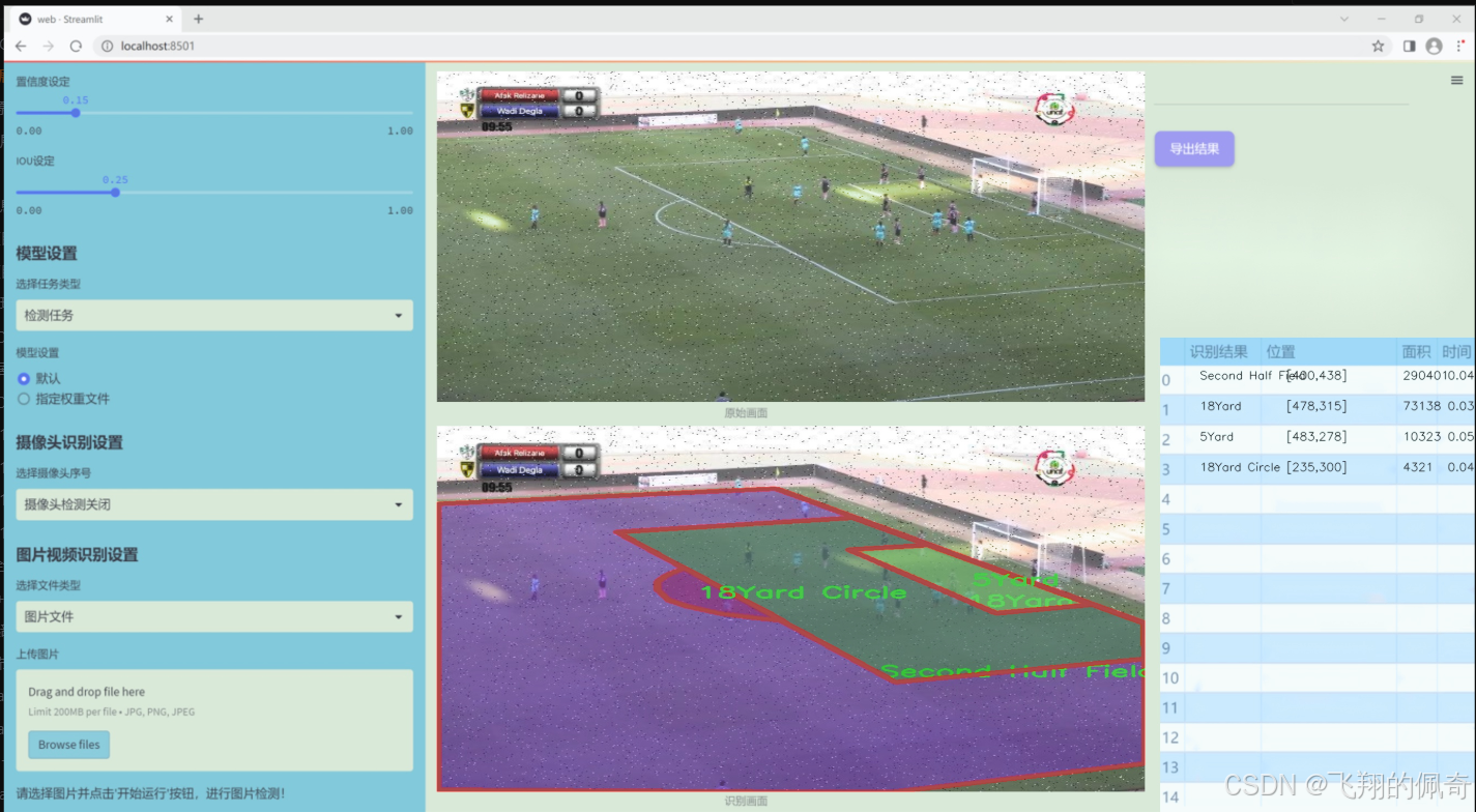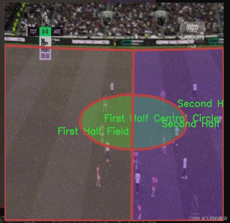 此外,数据集中还包括了"First Half Central Circle"和"Second Half Central Circle",这两个类别标识了比赛上下半场的中心圈,能够帮助模型理解比赛的节奏和场上动态变化。而"First Half Field"和"Second Half Field"则提供了整个场地的分割信息,使得模型能够在不同的比赛阶段中进行准确的区域识别。
