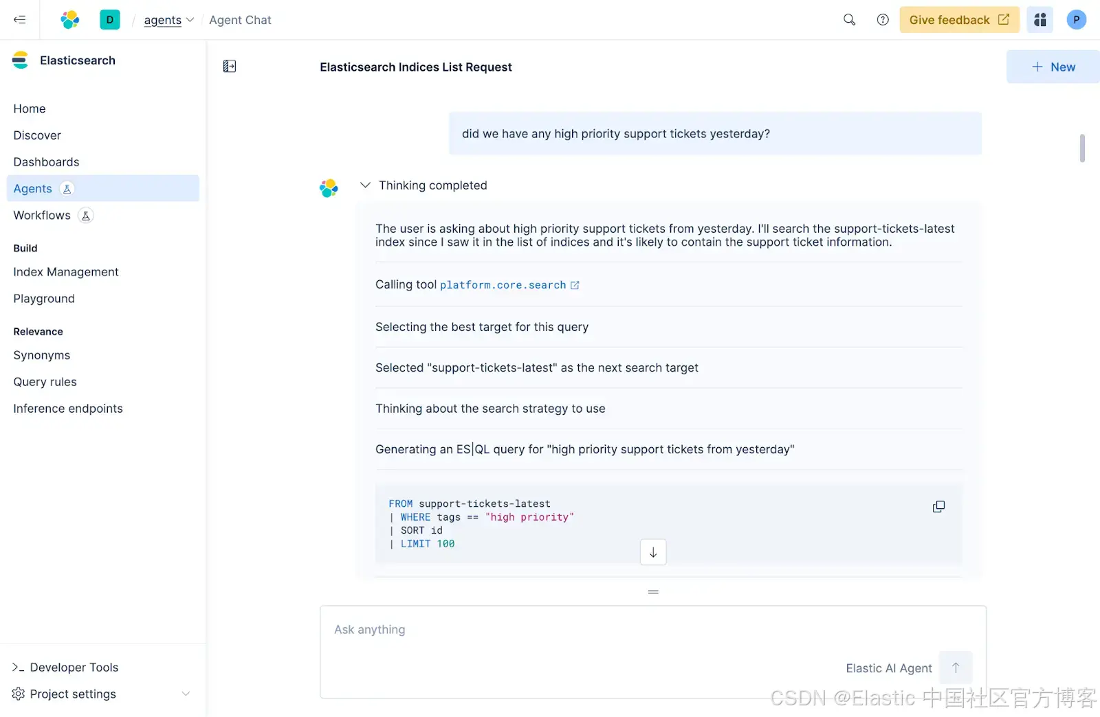 - 立即与数据对话:Agent Builder 包含一个内置的原生对话代理。开箱即用,你就可以向 Elasticsearch 中的任何数据提问并交互,让你的数据成为一个主动的对话伙伴。