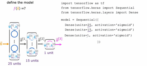 第一步是指定如何根据输入x和参数w和b计算输出,这可以用上面我们说过的dense函数代码来实现,用来指定神经网络,这实际上足以指定前向传播或推理算法中所需的计算