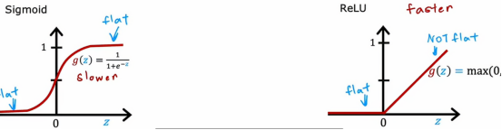 事实证明,ReLu激活函数是训练神经网络时最常见的选择,尽管最初我们用sigmoid激活函数描述了神经网络,因为在神经网络发展的早期,历史中,人们都在许多地方使用sigmoid激活函数,现在这个领域已经发展到更常使用ReLu而几乎不再使用sigmoid函数,唯一的例外是如果输出层的输出是一个二进制,我们会倾向使用sigmoid函数来处理分类问题,这里有几个原因,首先如果我们比较ReLu和sigmoid函数,ReLu的计算会稍微快一点,它只需要零和Z那个值更大一点,而sigmoid的函数则需要取指数运算然后逆运算;第二个原因,更重要的是ReLu函数只要一个方向变平,而sigmoid函数却在两个方向变平,在图像左侧变平,在图像右侧也变平,如果我们用梯度下降算法来训练神经网络,当函数在平坦的时候,梯度下降会变得很慢,虽然我们知道梯度下降算法优化的是成本函数J而不是优化激活函数,,但激活函数是计算的一部分,这样也会影响成本函数J在很多地方变得平坦,并且梯度较小,这回减缓学习速度。在经过研究人员发现,使用ReLu函数可以使神经网络学习地更快,这就是为什么对于大部分从业者,如果想使用什么激活函数用于隐藏层的话,ReLu激活函数已经成为最常用的选择