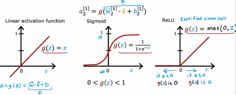 这里需要说明一下,最左边的是线性激活函数,有时我们使用线性激活函数,人们会说我们没有使用任何激活函数,因为,如果a是g(z),a就等于g(z)=w·x +b/2,所以这个好像根本没有g,所以当我们使用这个线性激活函数时,有些人就会认为我们没有使用任何激活函数