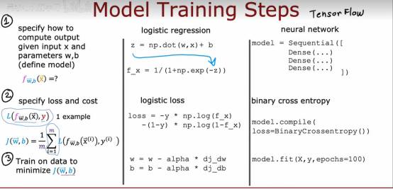 第二个部分是让TensorFlow编译模型,让TensorFlow编译模型的关键步骤是指定我们要使用的损失函数,在这个例子我们会使用一个名为BinaryCrossentropy的损失函数,称为稀疏分类交叉熵,我们会在下一节详细说明,然后指定好损失函数,它告诉TensorFlow用我们在第一步指定的模型,以及第二部指定的损失函数,来拟合数据集x,y