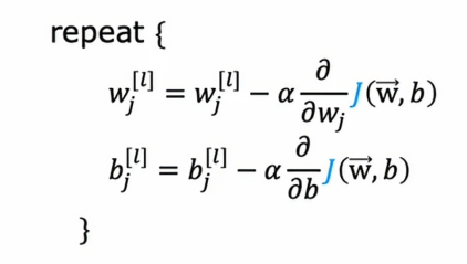 这让我们想到之前学过的梯度下降算法,如果我们用梯度下降来训练神经网络中的参数,然后我们会在每一层L和每一个单元J上反复地更新