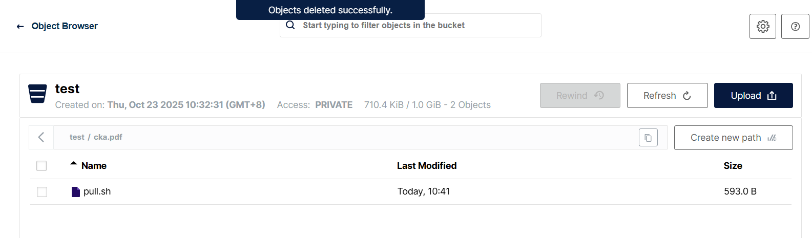 [root@master ~]# mc cp pull.sh myminio/test #指定桶名