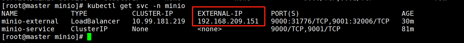 minio-external LoadBalancer 10.99.181.219 192.168.209.151 9000:31776/TCP,9001:32006/TCP 29m
