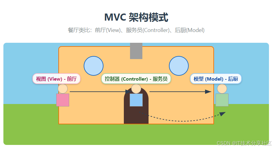 大家可以想象比如一家餐厅:顾客在前厅(View)点餐,服务员(Controller)传递订单,后厨(Model)准备菜肴。各司其职,互不干扰。