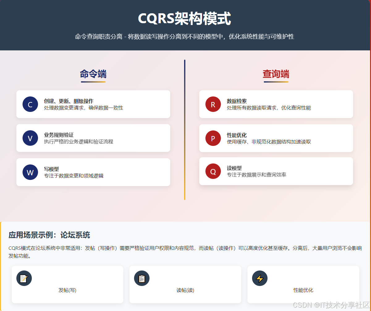 场景举例:比如论坛系统。发帖(写)需要严格验证,而读帖列表可以高度优化甚至缓存。分离后,大量用户浏览不会影响发帖功能。