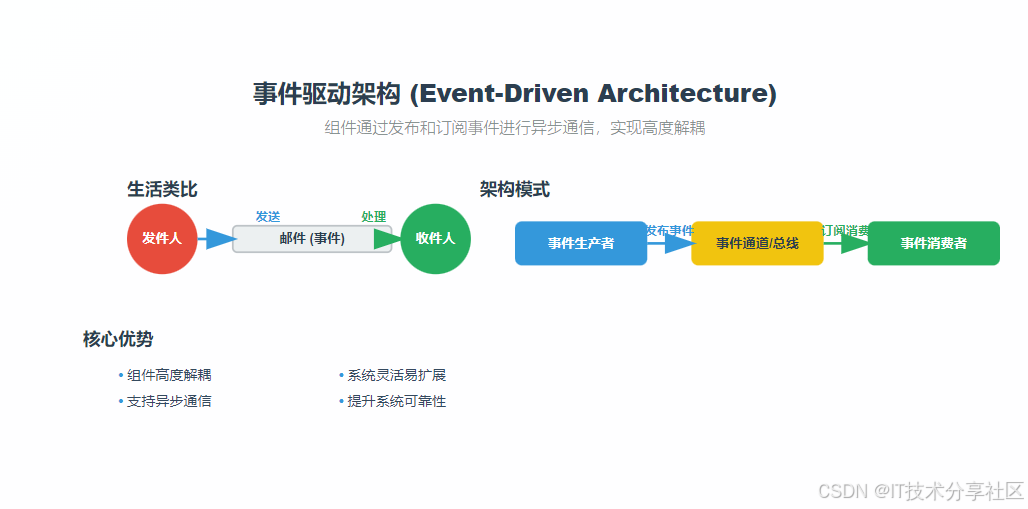 事件驱动架构基于事件的产生、检测和消费来构建系统。组件通过发布和订阅事件进行通信,而不是直接调用彼此的方法。这种异步通信模式创造了高度解耦的系统,组件之间不需要知道彼此的存在。