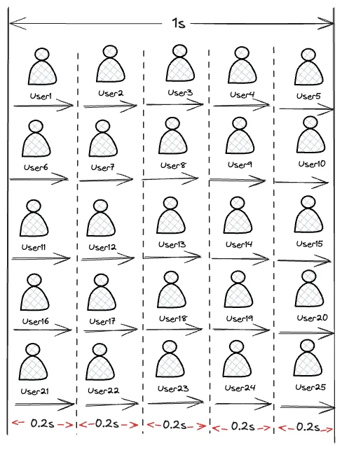 上图 压力线程 为 5个,在 1 s 内有 5个线程可以完成5 次请求,那根据上面的公式可知并发用户数为 : = 25(完成的事务总数)*0.2= 5,显而易见,这个5 是并发线程的个数,从上图可知每一个事务才是一个真实的用户,显然这里的并发用户数为25个。