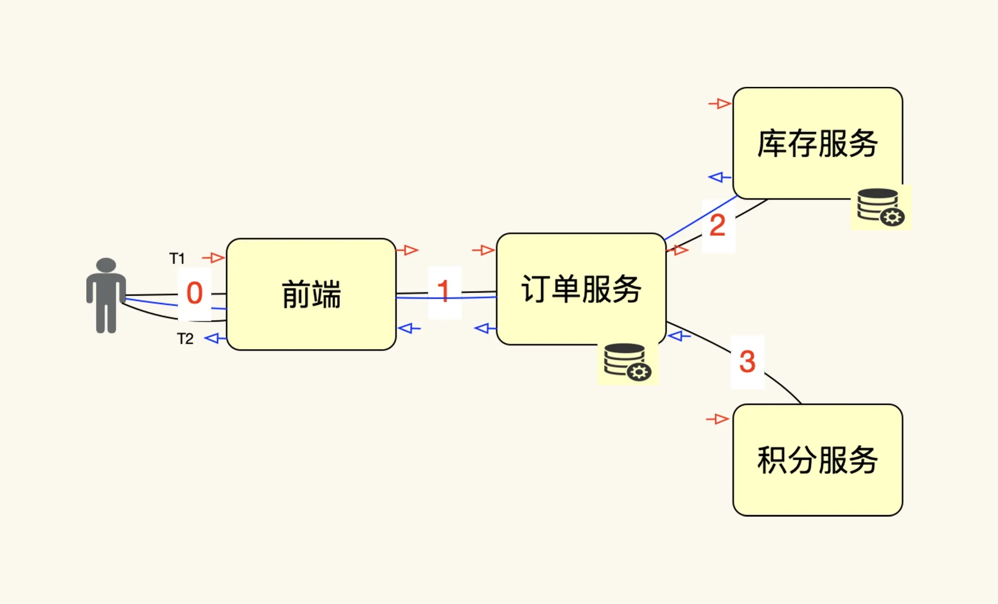 如上图所示(此图为网上摘自),如果压力工具中的一个线程(图中人的位置)发出一个请求(也就是在图中 0 的位置),系统中共产生了 4 个请求(图中的 0、1、2、3 位置),不管这些请求是同步还是异步,这些请求都是真实存在的。如果再来一个线程,也发同样的一个请求,那系统中必然总共产生 8 个请求,这个逻辑很清楚。如果我们把压力工具中线程的请求做为一个 T(压力工具中的事务数),那它对应的后端就应该是 4 个 R(后端请求总数);