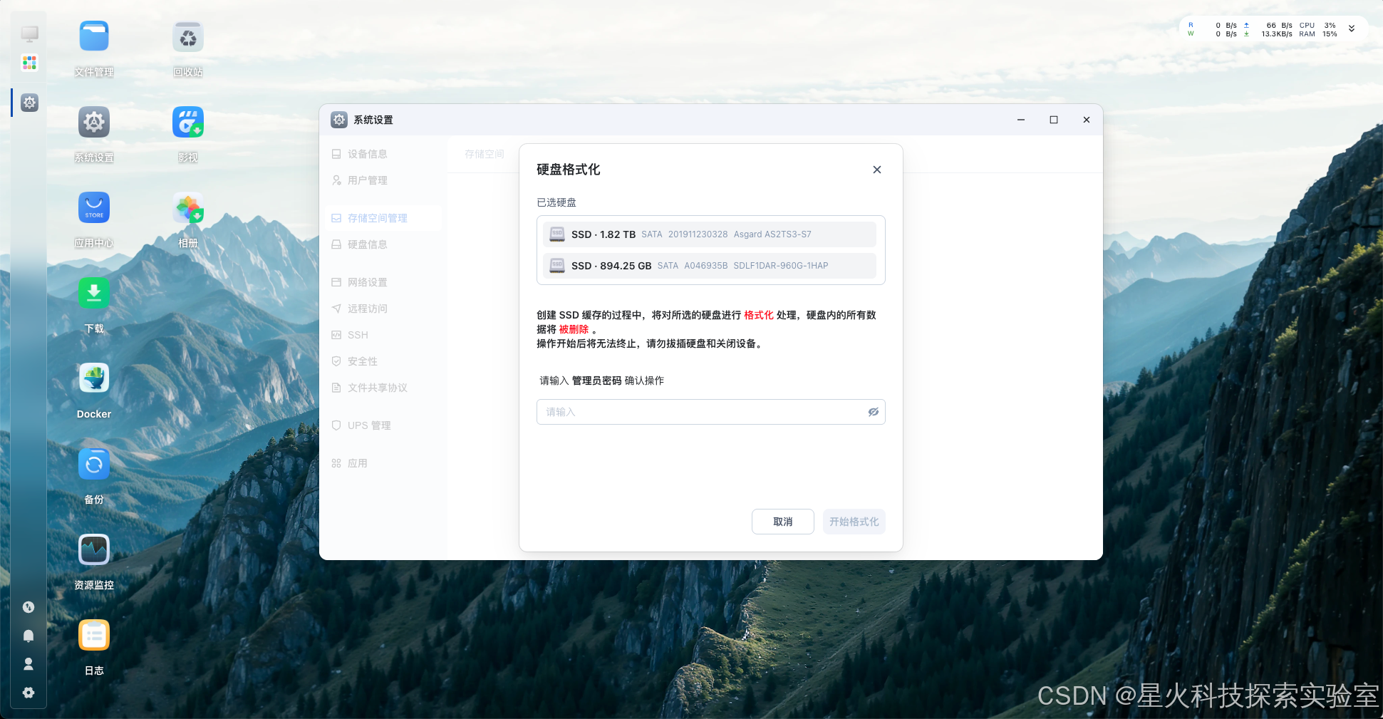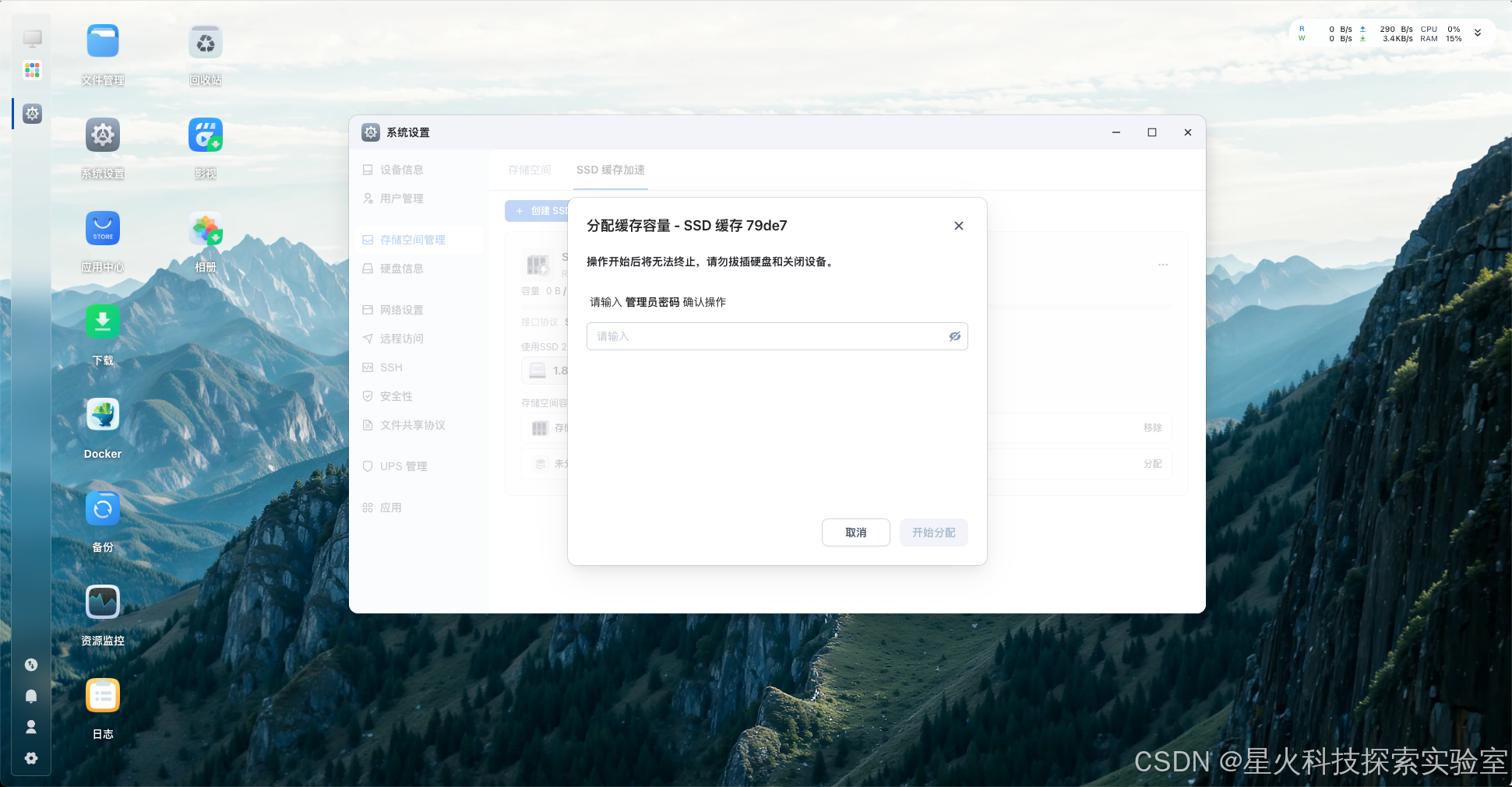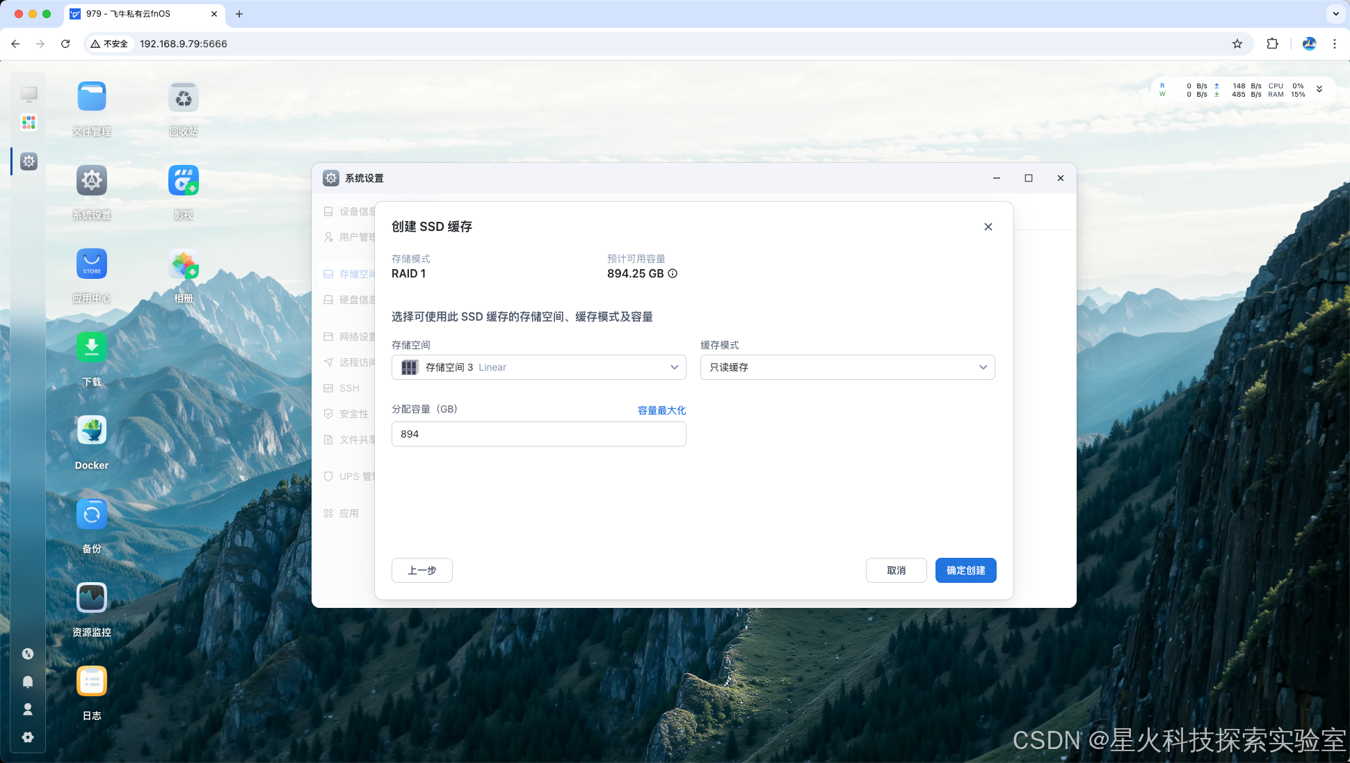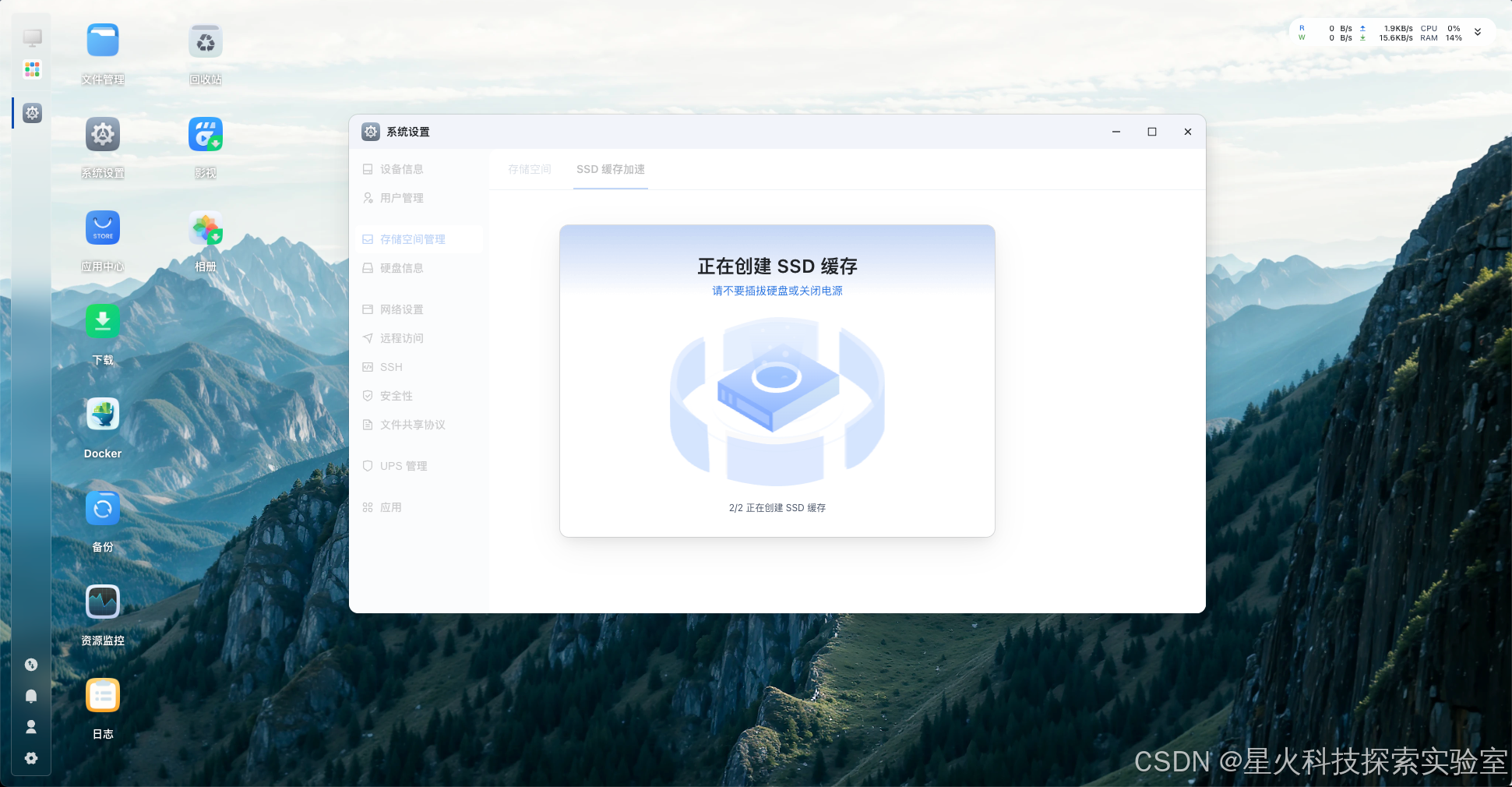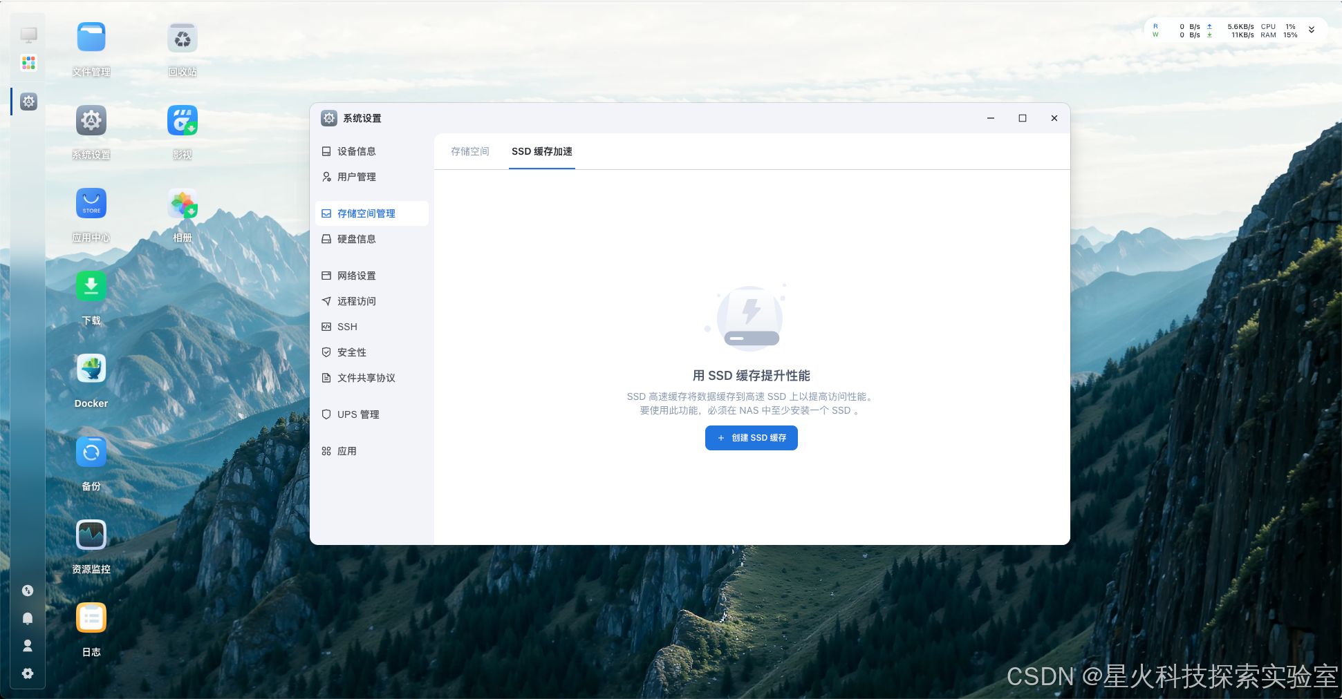 - 登录与进入设置:以管理员身份登录飞牛云系统,在桌面依次打开"设置 > 存储空间管理 > SSD缓存加速",点击"创建SSD缓存"按钮。