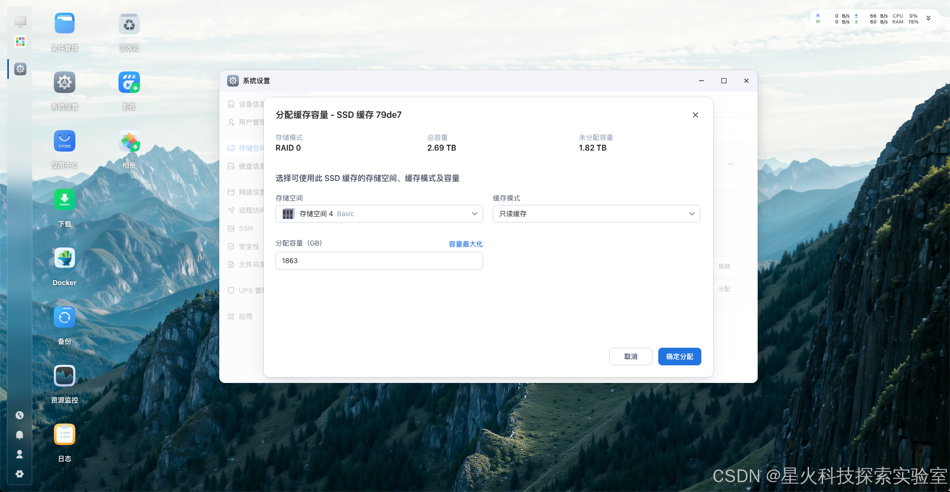 点击"分配",选择目标存储空间、分配容量及缓存模式,然后点击"确认"。