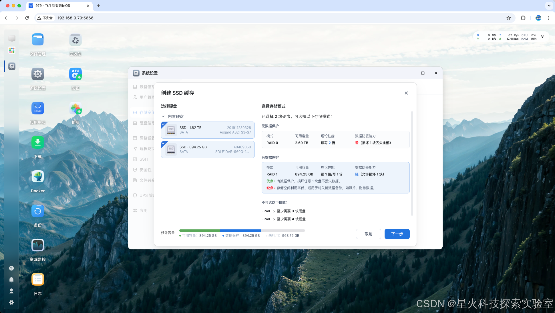 - 选择硬盘及模式:在页面左侧选择用于创建SSD缓存的一个或多个硬盘。根据所选硬盘数量,右侧会动态显示可用的存储模式。选择模式后,可在弹窗底部查看缓存的预计容量。确认无误后,点击"下一步"。