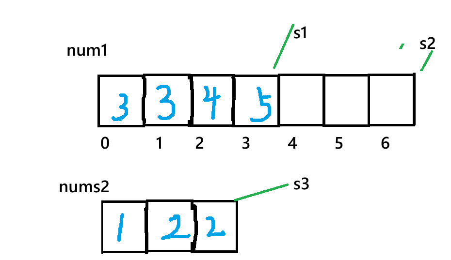 nums1中。 此处提示我们要利用好原数组的空间,所以,我们本题的解法围绕着**nums1**后解法:三指针法: 创建三个整形指针,例:s1,s2,s3 分别指向:1数组的头,尾部,2数组的尾部,之后再进行操作: