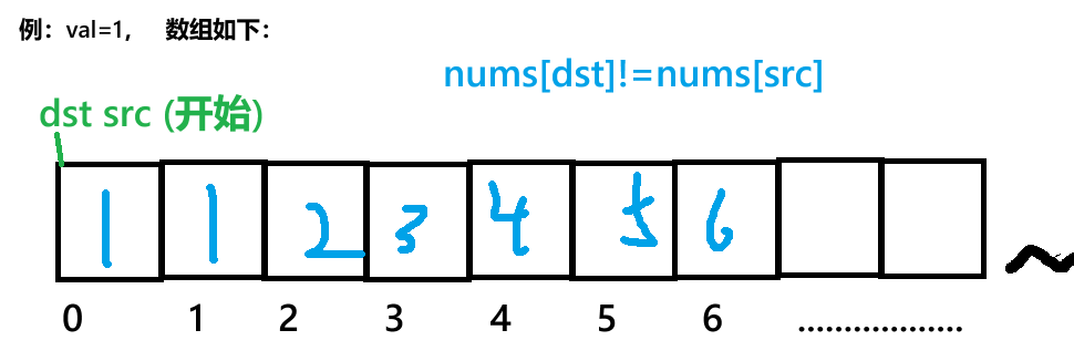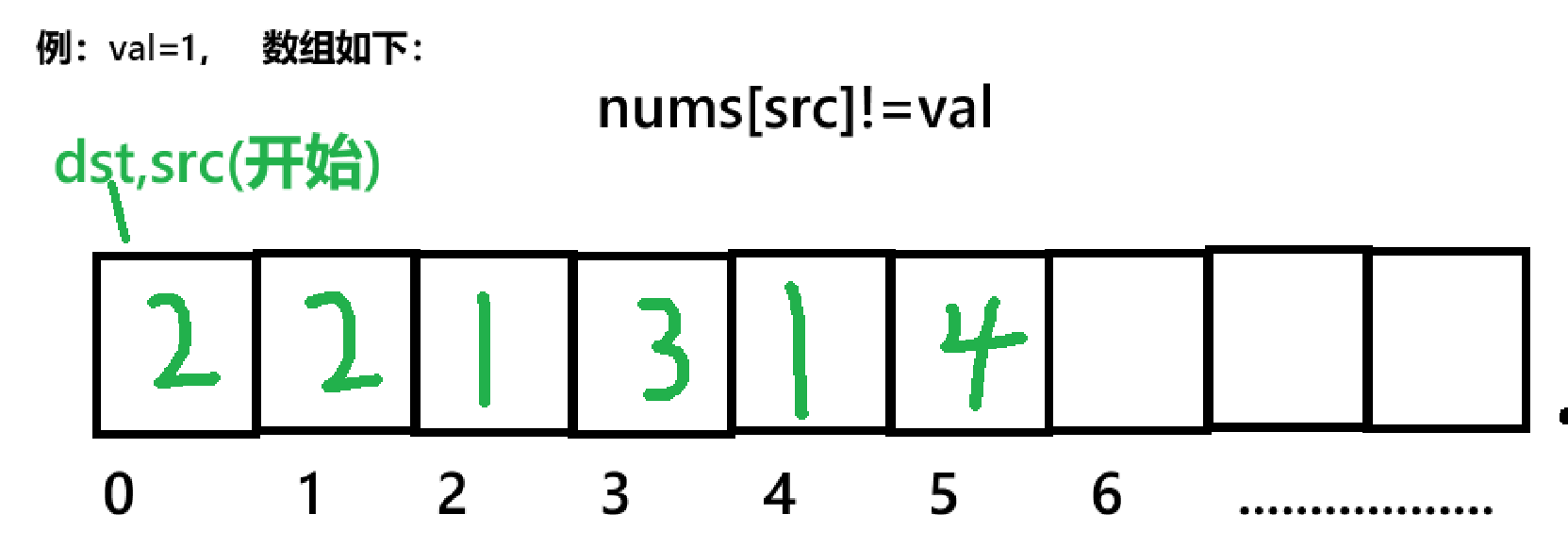 src:遍历整个数组,寻找不等于val的元素。dst:指向当前需要填充的位置,仅在src找到有效元素时移动。步骤分解