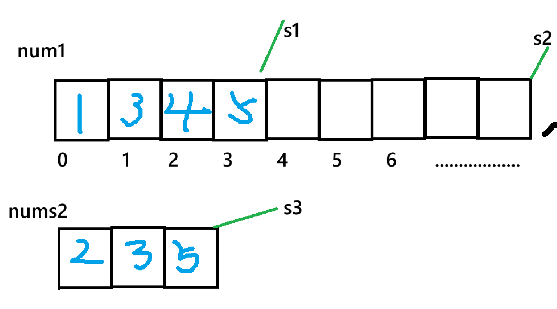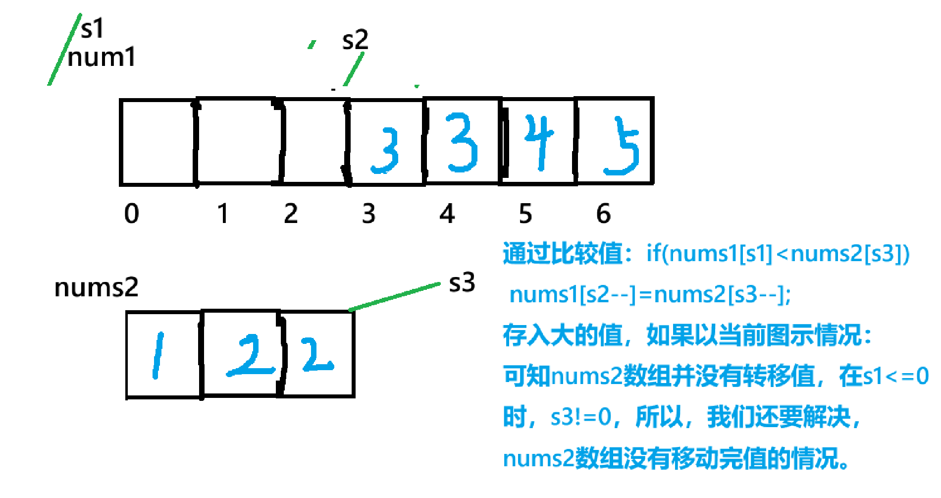 - 即比较两数组下标s1,s3值对应的大小,nums1[s1] < nums2[s3]:将 nums2[s3] 放入 nums1[s2],s3 和 s2 均左移一位(s3--,s2--)。