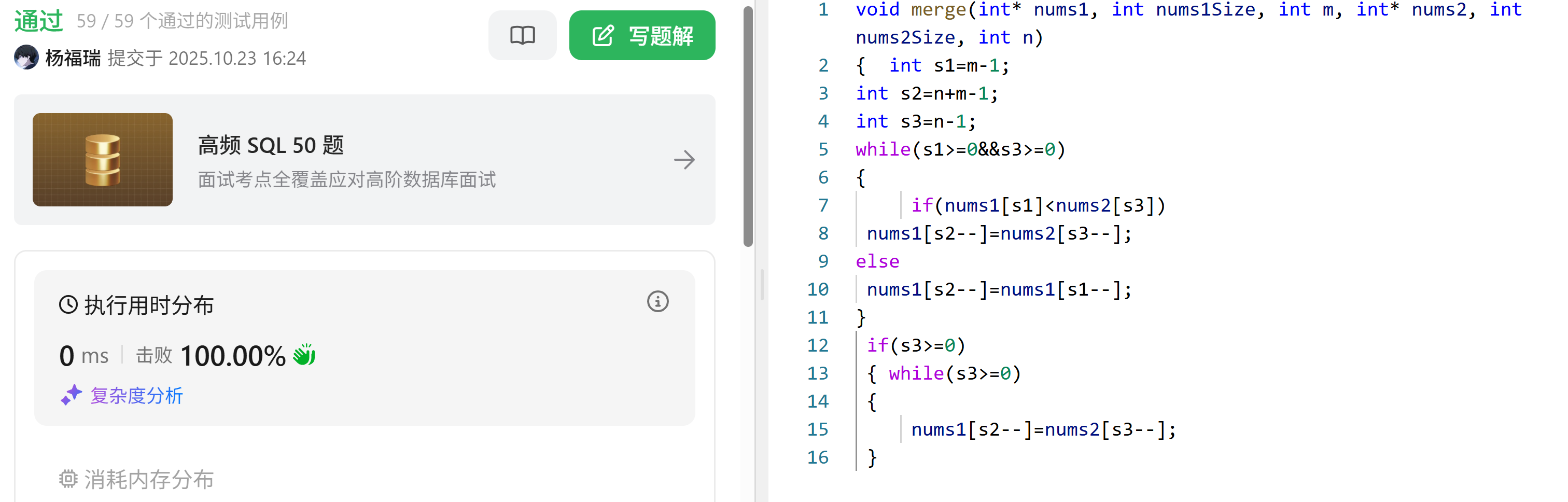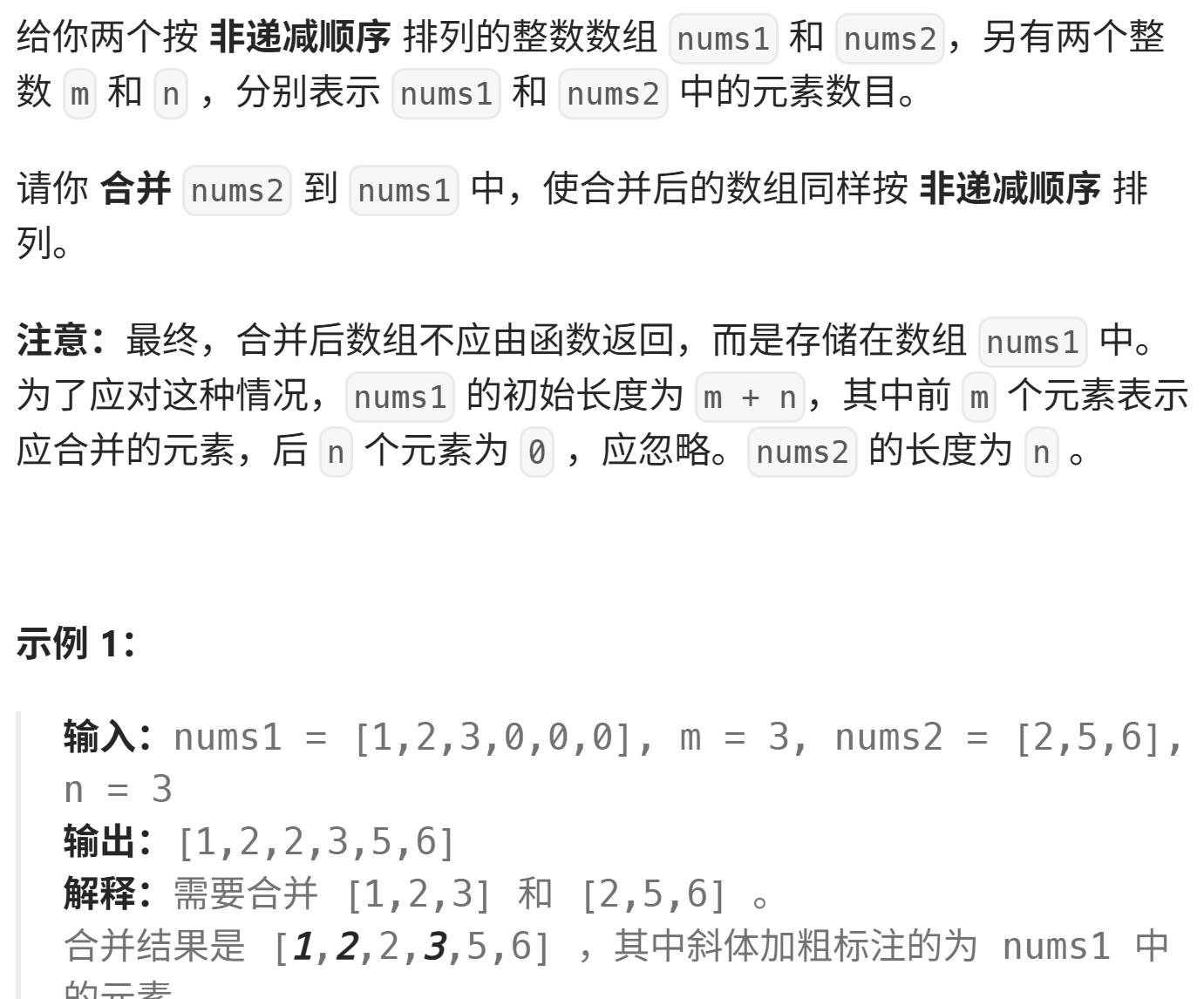 本题思路:题目的要求挺多,注意:最终,合并后数组不应由函数返回,而是存储在数组