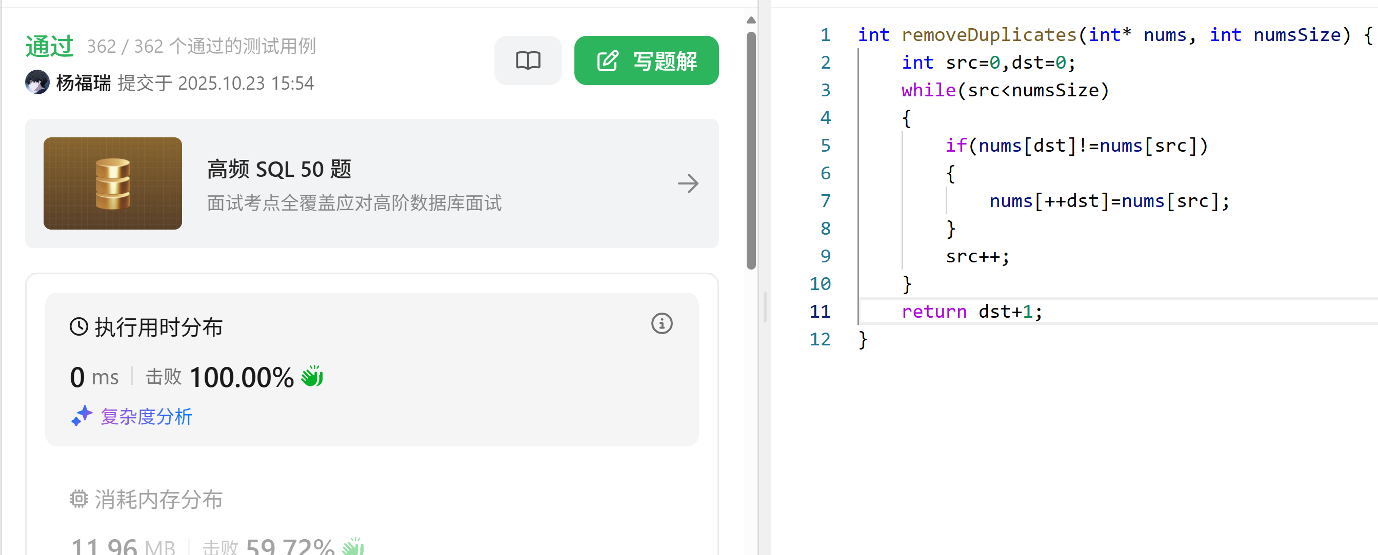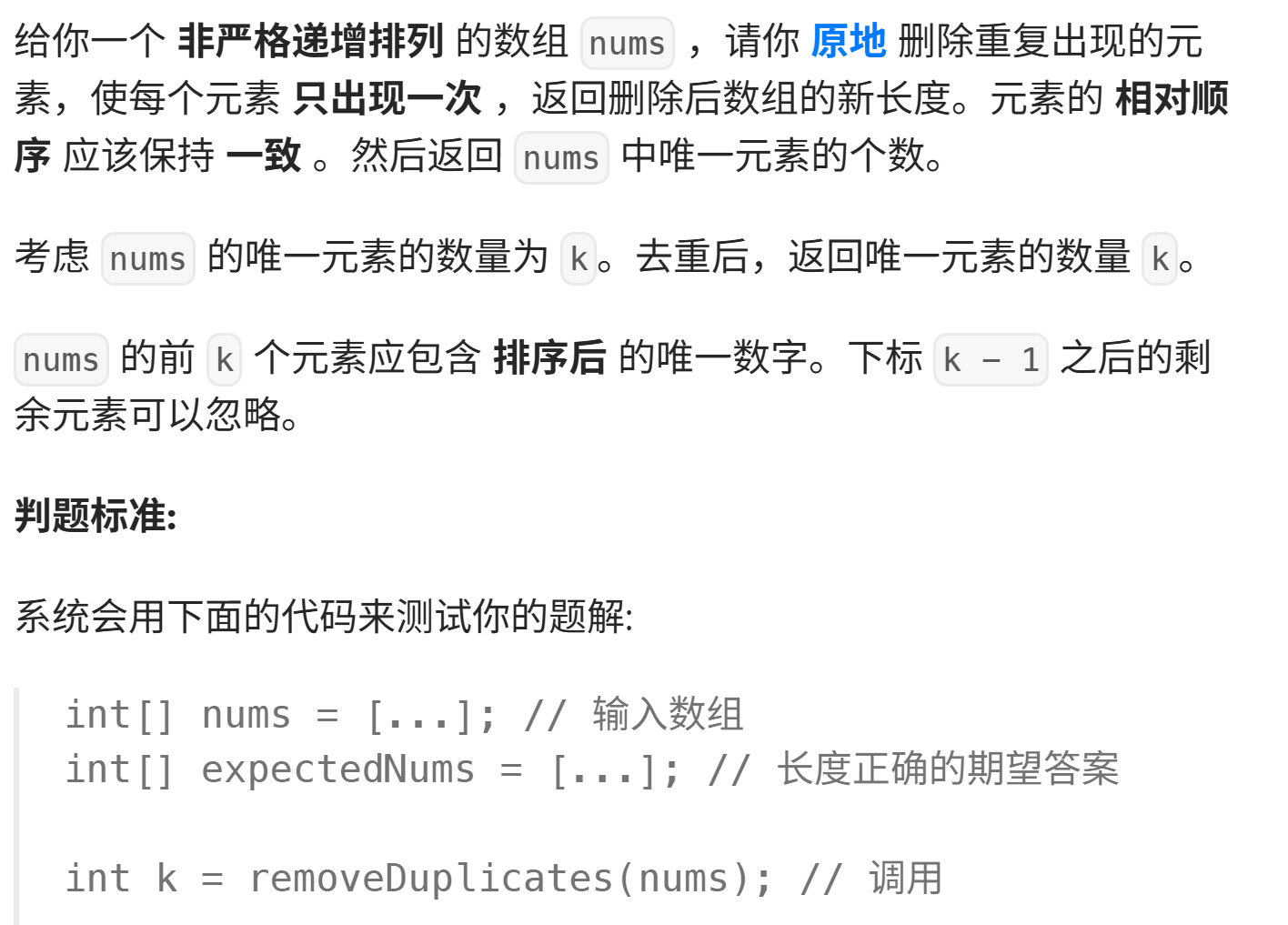 该函数用于移除非严格递增排序数组中的重复元素(只保留一个),返回移除后数组的新长度,空间复杂度为 O(1)(原数组上修改)。