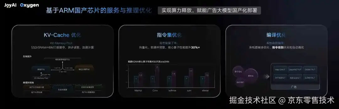 除了延迟和安全,我们还做了基于 ARM 国产芯片的服务与推理优化,让大模型能在国产硬件上高效运行,实现算力自主可控。这里有三个核心优化方向:
