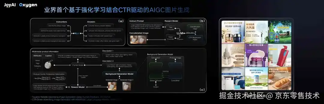 京东广告的图像、视频的生成+优选能力,破除传统生成技术"好看但不转化"问题,以CTR为指导,平衡视觉审美与商业价值。