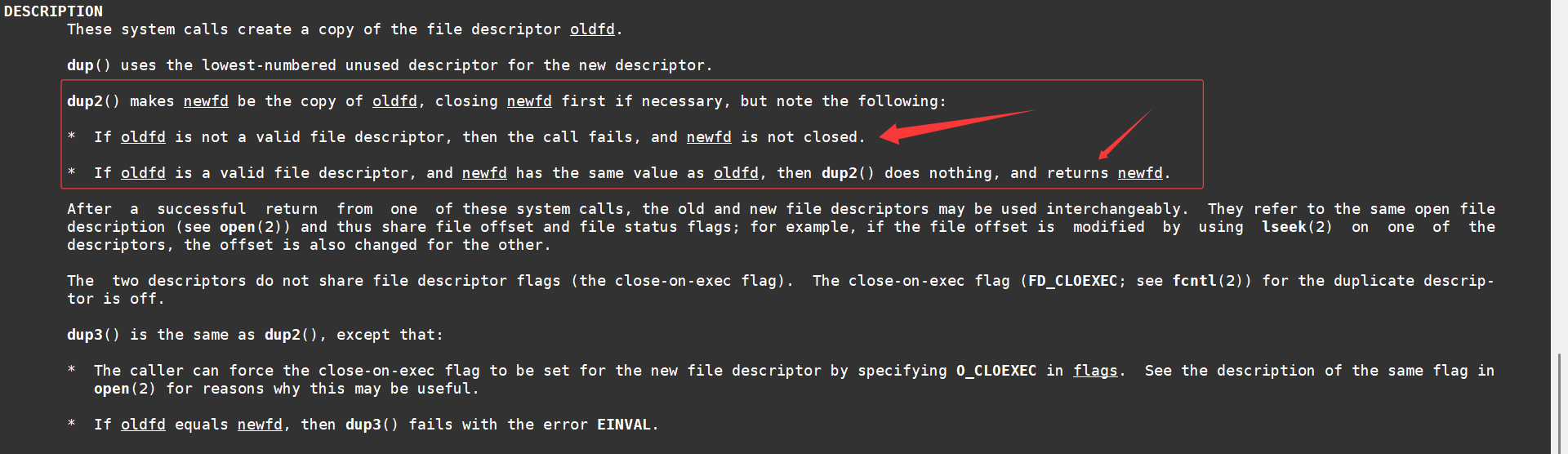 dup2() 会将 newfd 作为 oldfd 的副本,必要时会先关闭 newfd ,但请注意以下几点: