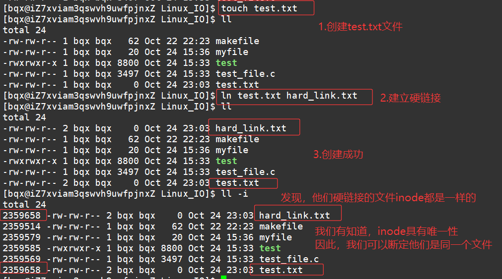硬链接是通过inode(索引节点)来建立链接关系,多个硬链接指向同一个 inode,本质上是同一个文件。