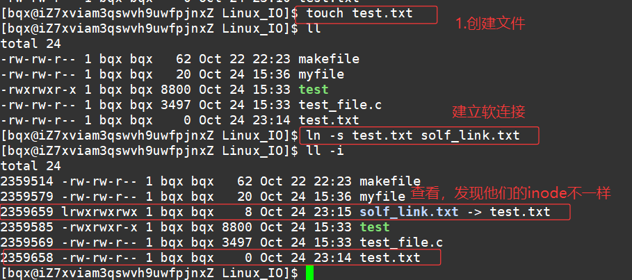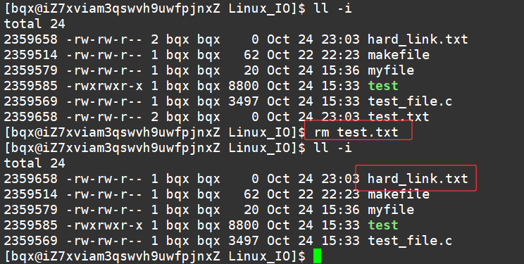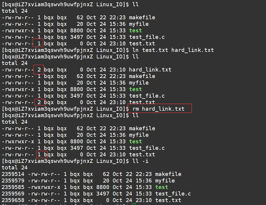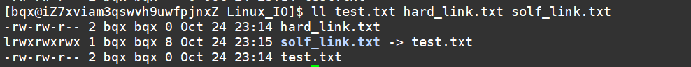 示例: ls -l file.txt hard_link.txt soft_link.txt