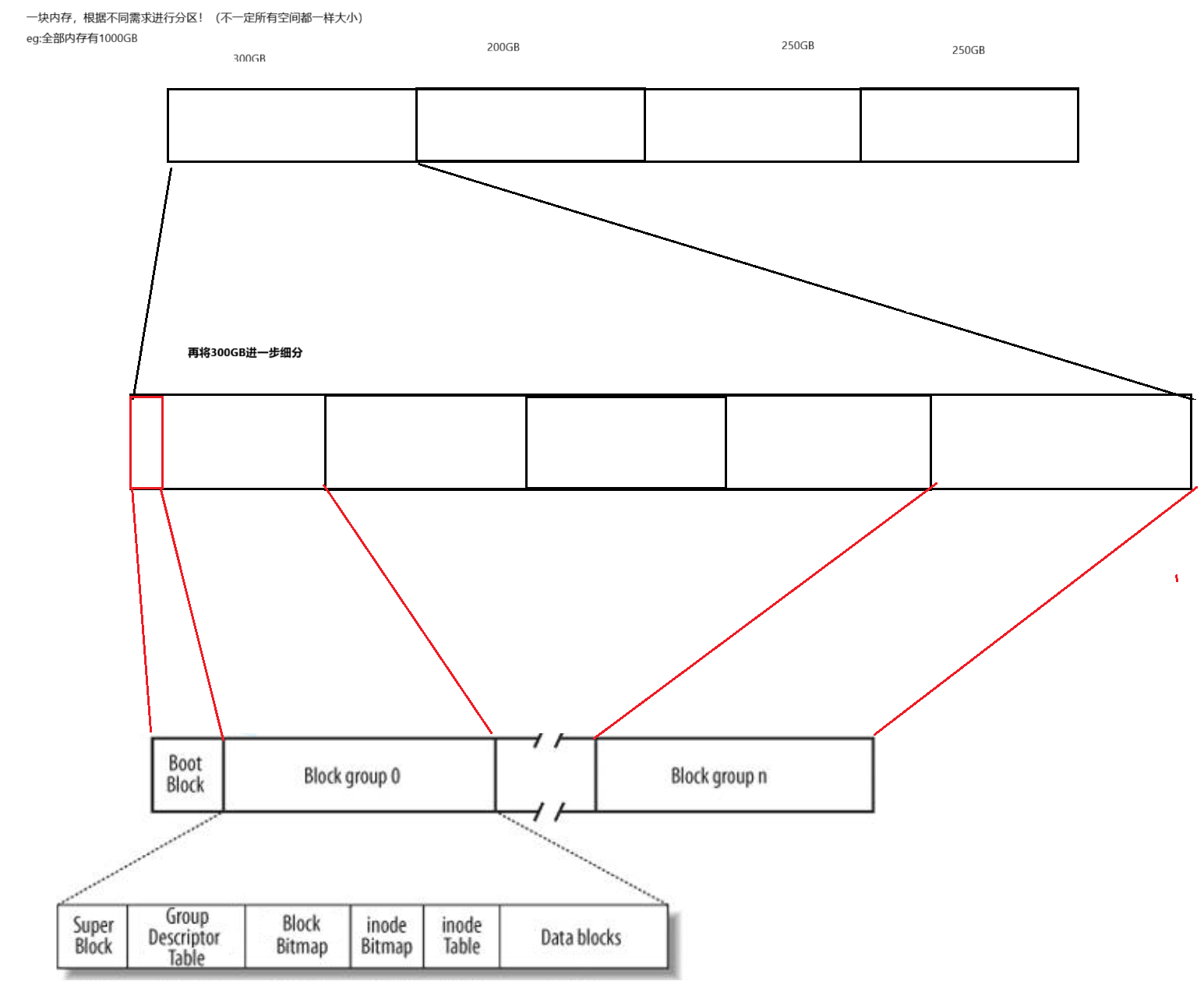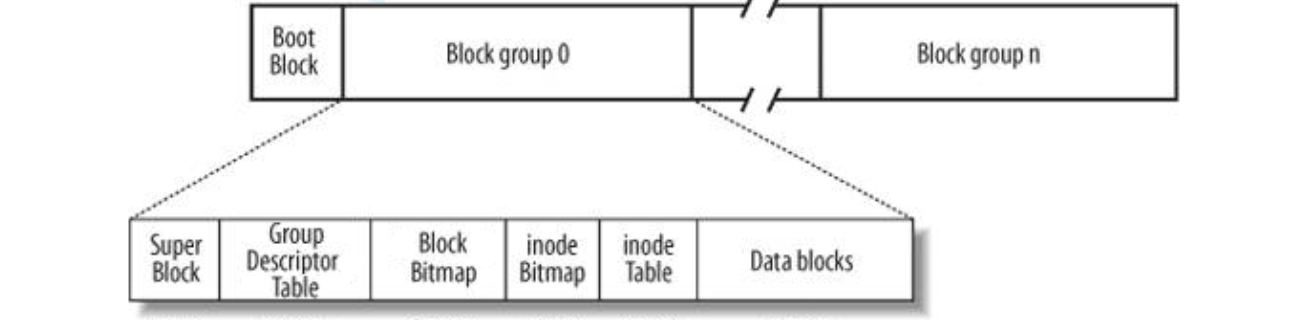 Linux ext2文件系统,上图为磁盘文件系统图(内核内存映像肯定有所不同),磁盘是典型的块设备,硬盘分区被划分为一个个的block。一个block的大小是由格式化的时候确定的,并且不可以更改。例如mke2fs的-b选项可以设定block大小为1024、2048或4096字节。而上图中启动块(Boot Block)的大小是确定的,