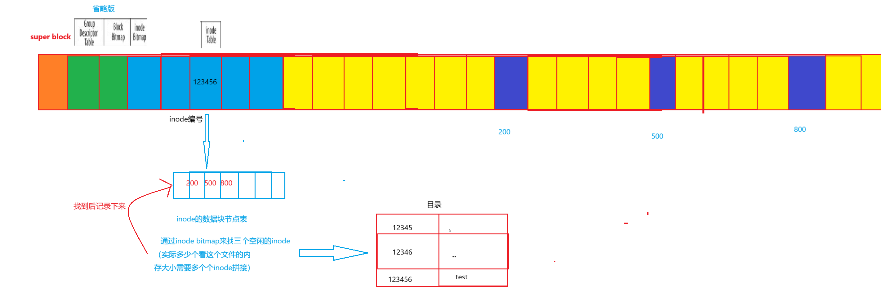 以图中为例,该文件的数据量需要占用3个磁盘块(200、500、800),这是因为文件的实际大小超过了单个磁盘块的存储能力,所以必须通过多个磁盘块的"拼接"来完整存储文件内容。inode(i节点)会记录这些磁盘块的编号列表(如200、500、800),从而让系统能够按顺序读取这些磁盘块,还原出完整的文件数据。