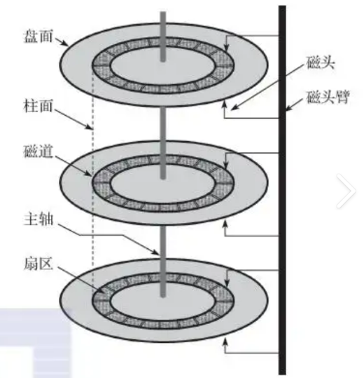 磁头与磁头臂:磁头一面一个,通过磁头臂移动;磁头和盘面不接触,避免物理损伤。