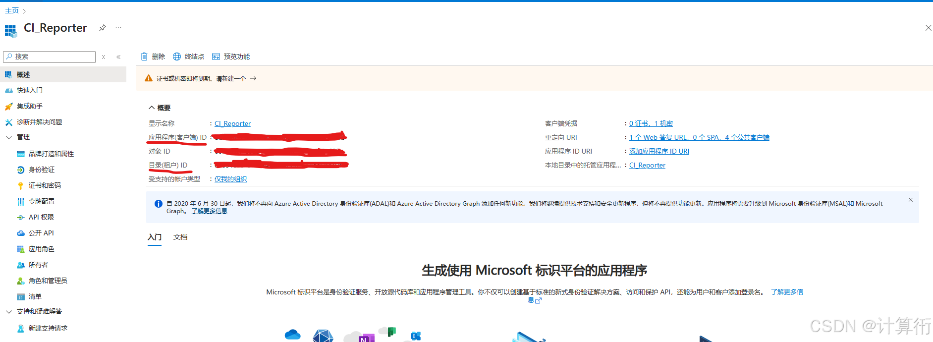 需要注意: 应用程序(客户端) ID 和 目录(租户) ID 这两个ID,再python创建脚本中会用到,不要泄露。