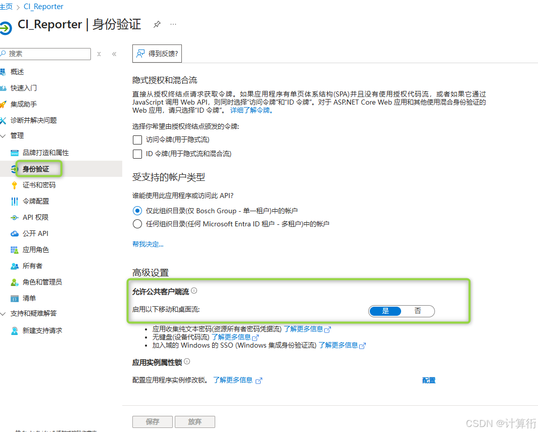 获取token时需要先在刚注册的APP中,打开 允许公共客户端流 ,如下图所示: