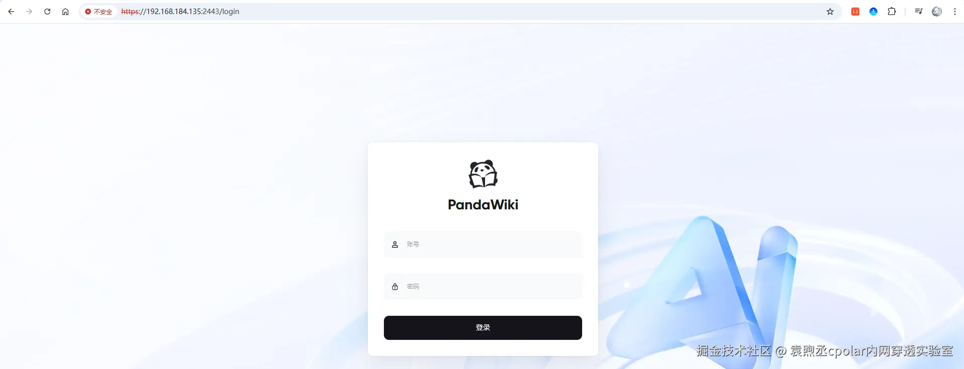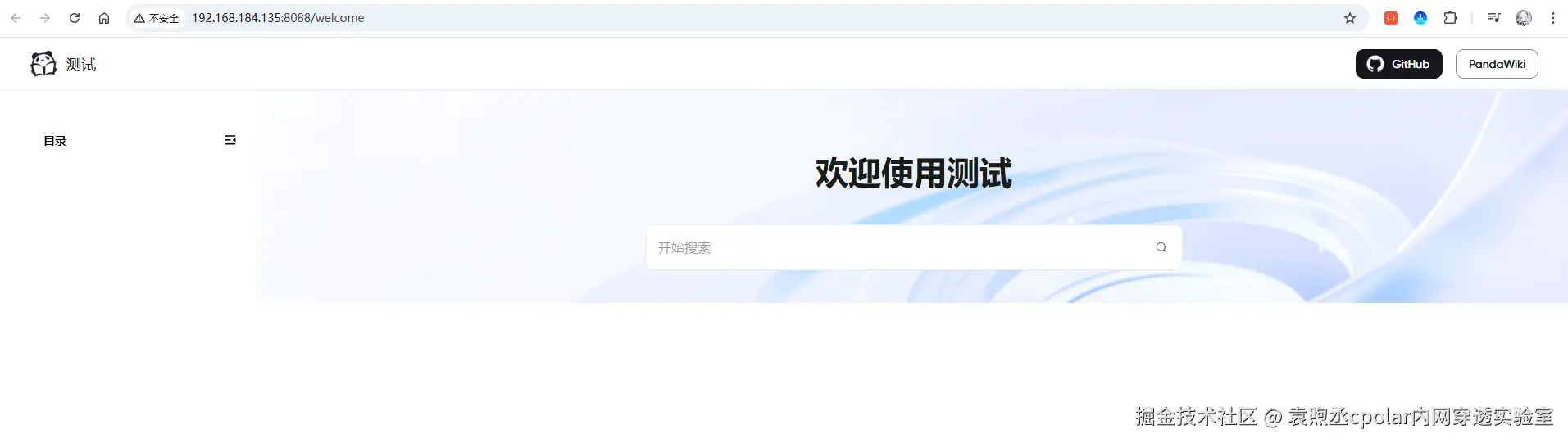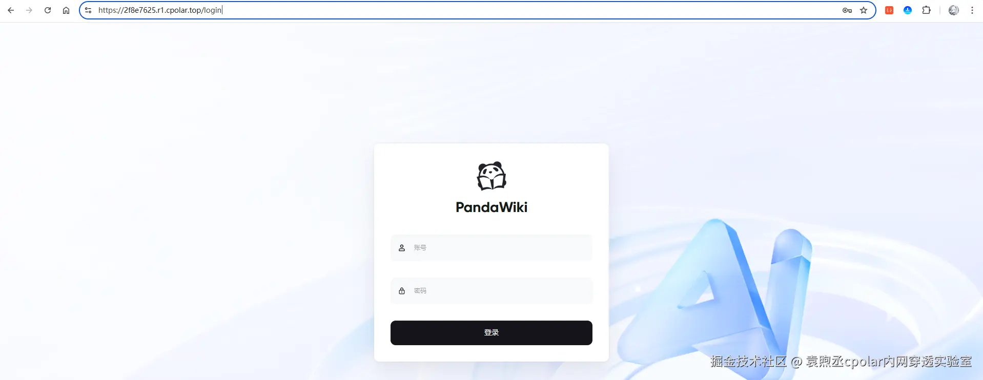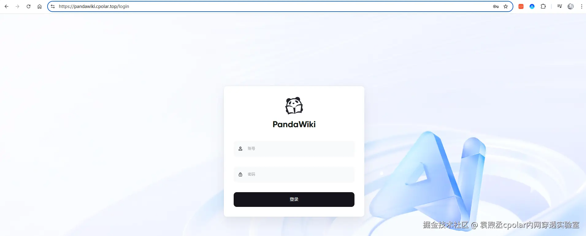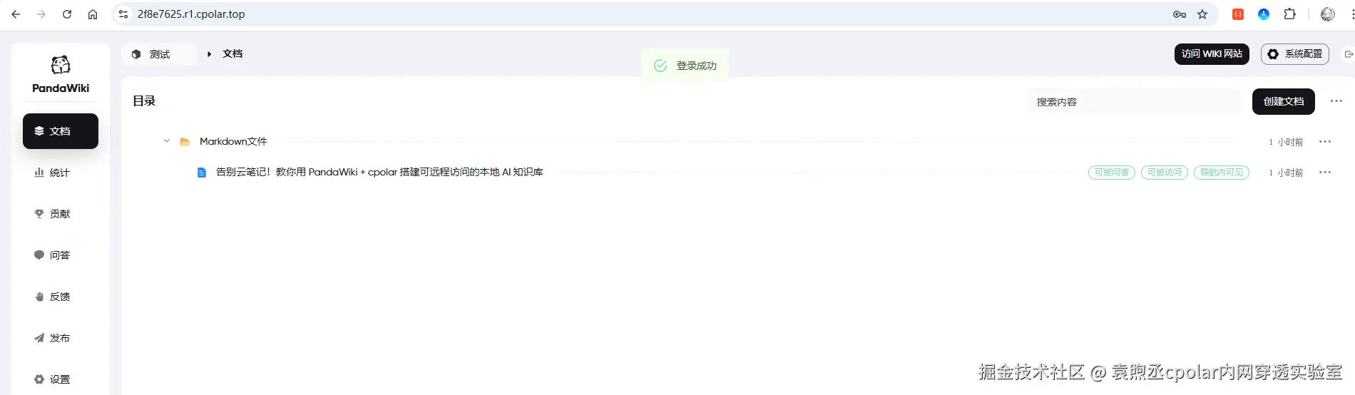 访问成功!至此,两个固定二级子域名均已生效:PandaWiki 管理后台与WIKI 首页都可通过固定的 HTTPS 公网地址稳定访问,分享与远程协作更省心。
