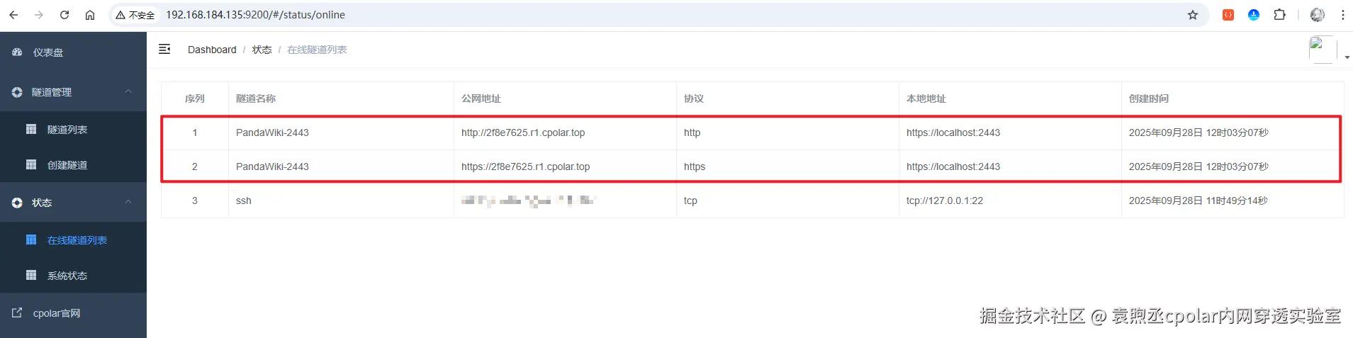 接着来到在线隧道列表,可以看到名称为PandaWiki-2443隧道的两条记录信息,一条协议为http,另一条协议为https:
