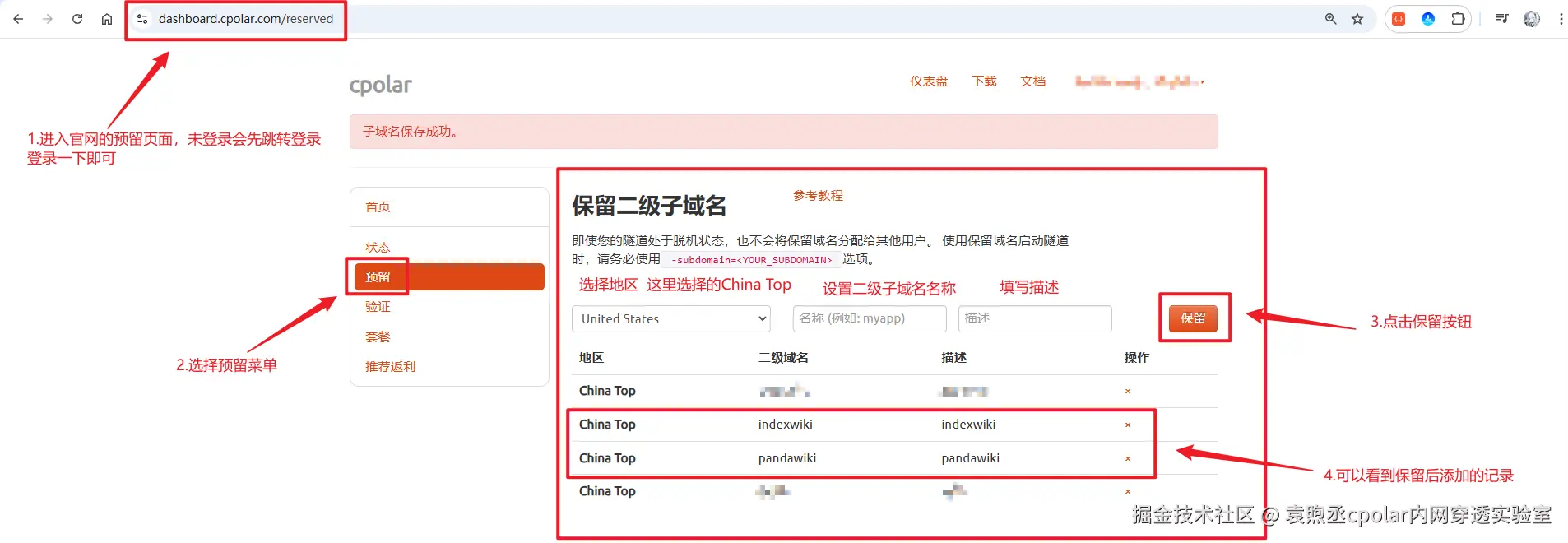 选择预留菜单,即可看到保留二级子域名项,填写其中的地区、名称、描述(可不填)项,然后点击保留按钮,操作步骤图如下: