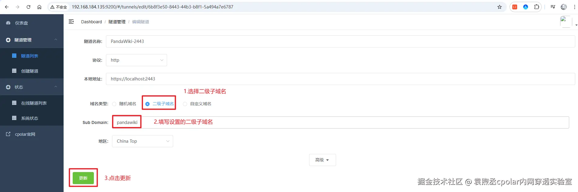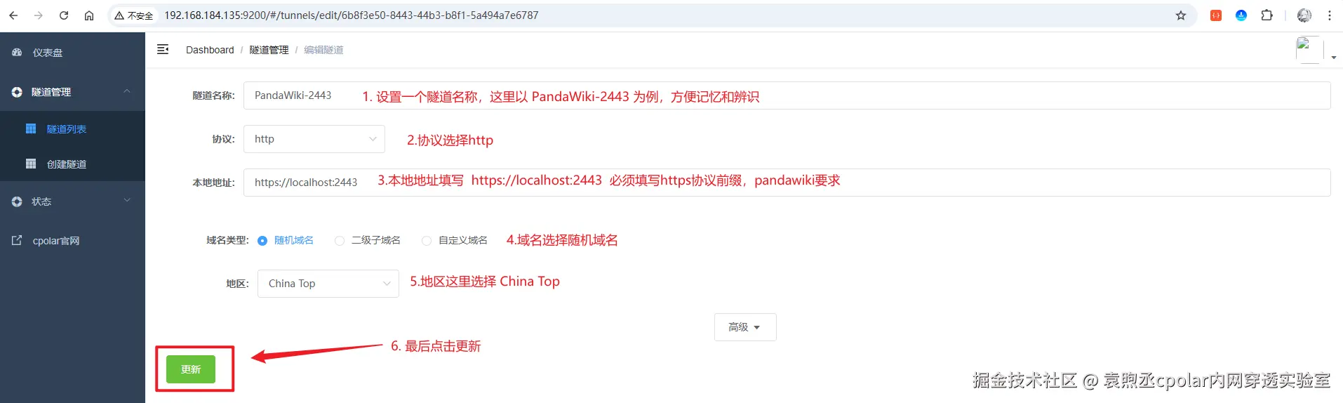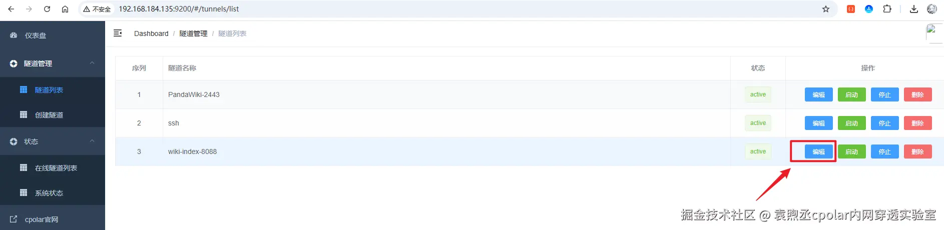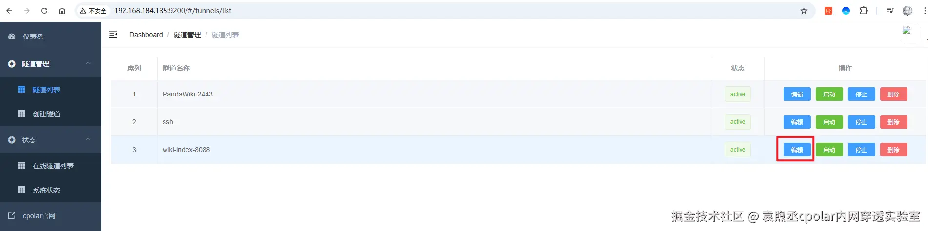 接着,进入侧边菜单栏的隧道管理下的隧道列表,可以看到名为PandaWiki-2443的隧道,点击编辑按钮进入编辑页面: