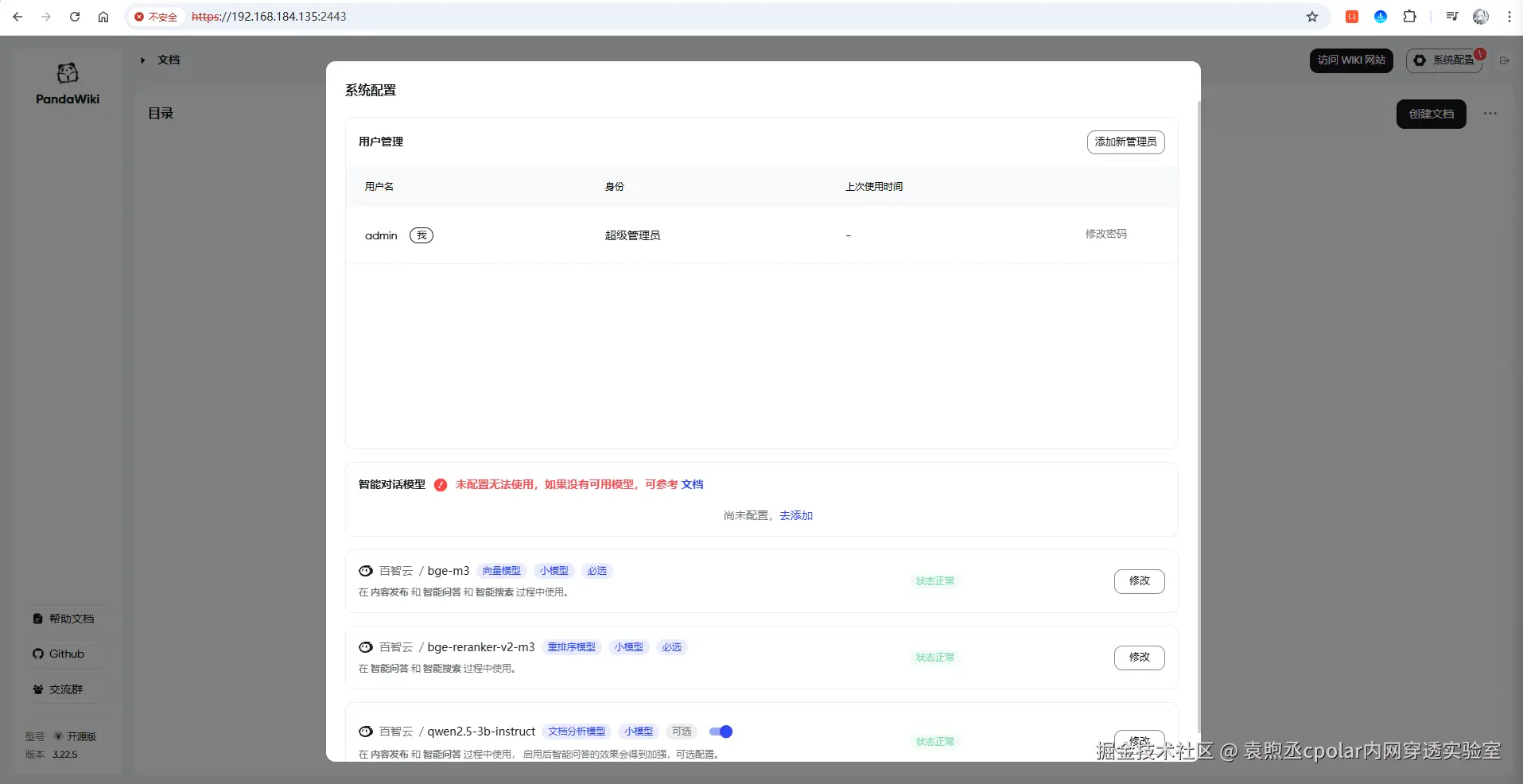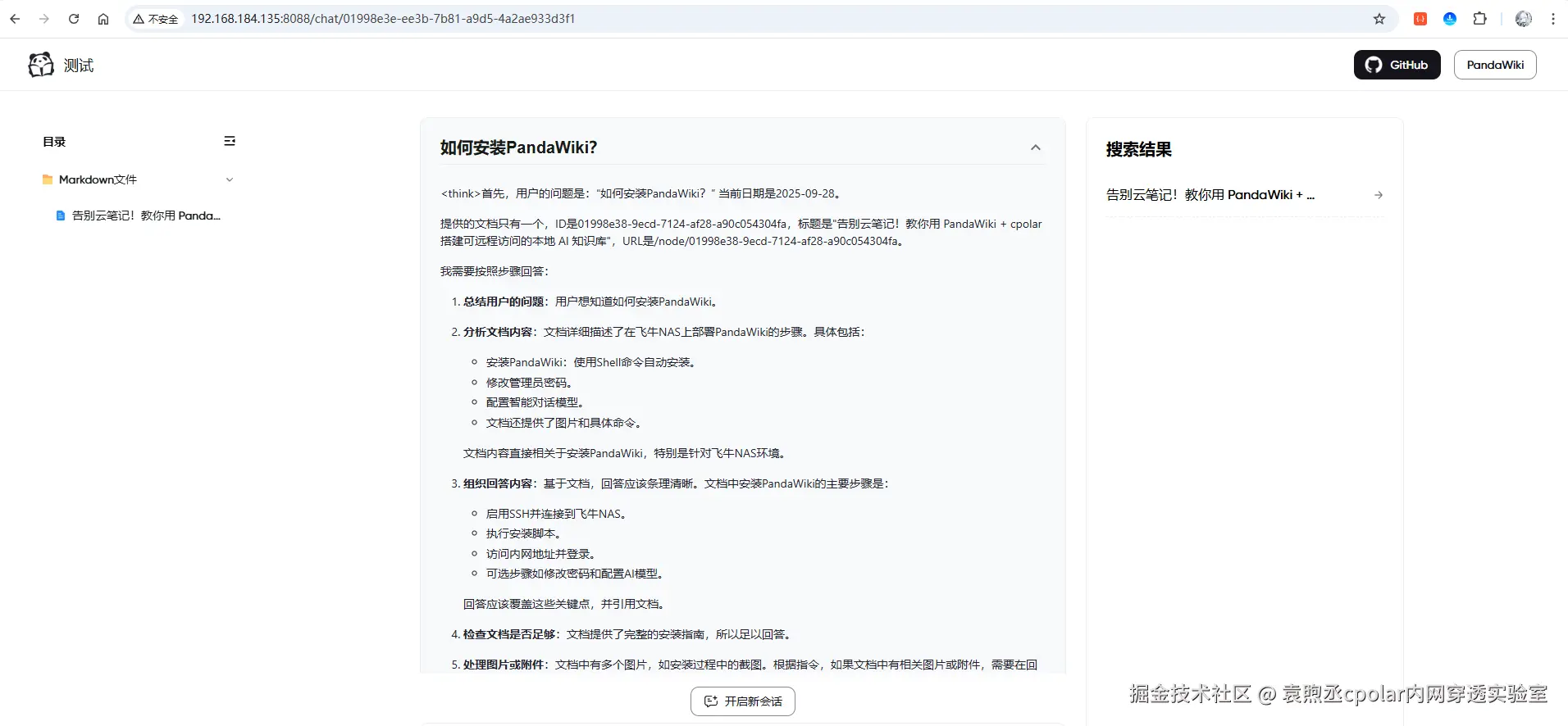 至此,PandaWiki 的部署与基础使用已经跑通:你已经完成了安装、初始配置、模型接入、文档导入与发布,AI 检索问答也能正常工作,本地内网访问一切 OK。