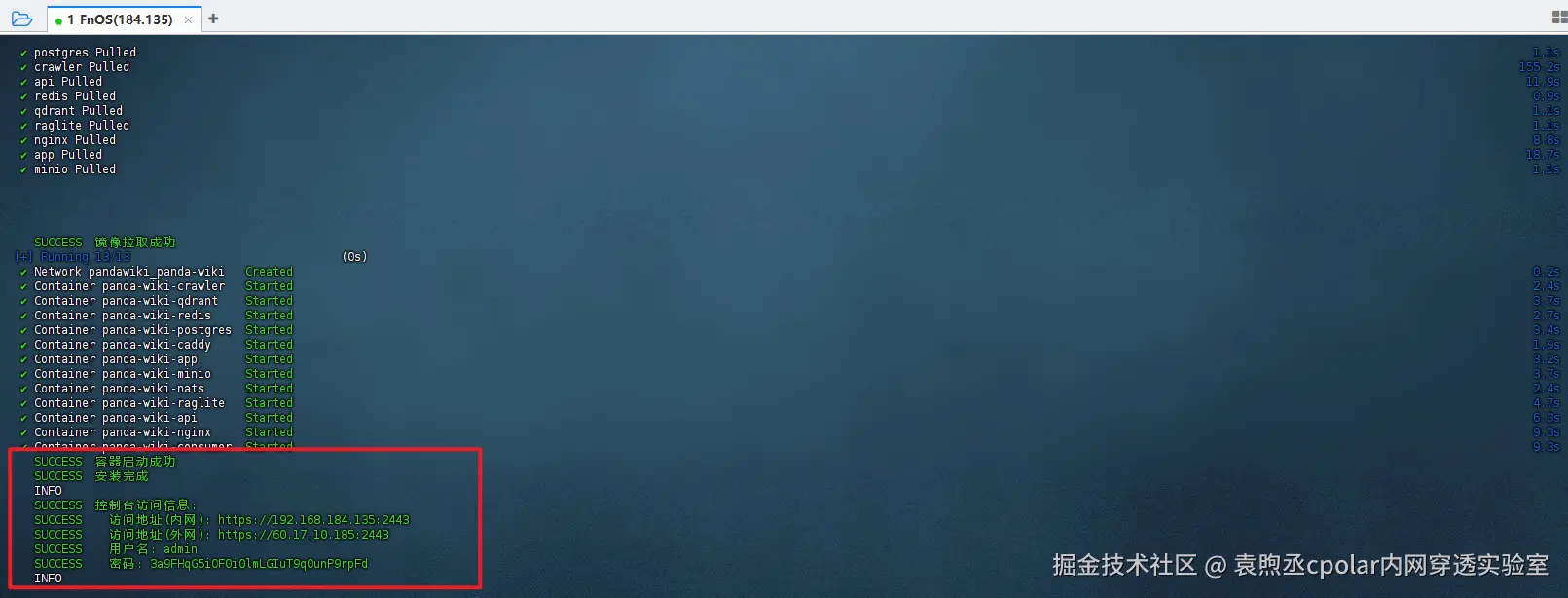 安装完成会有如下提示,记住其中的内网访问地址以及用户名和密码信息: