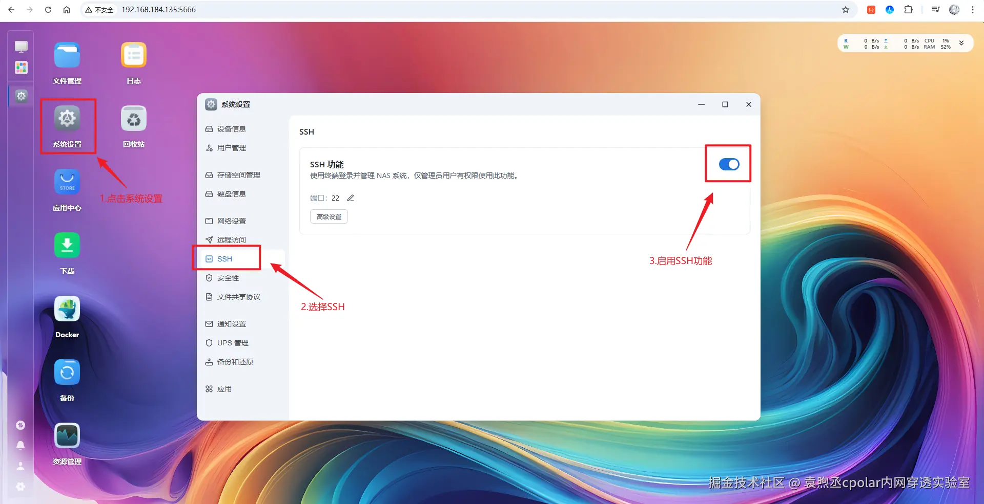 首先,登录到飞牛NAS,然后打开设置,将ssh这一栏的选项打开