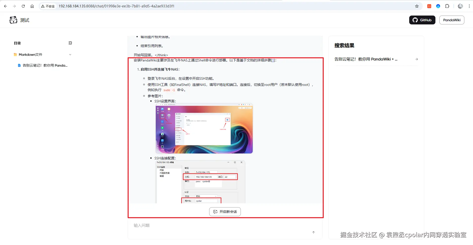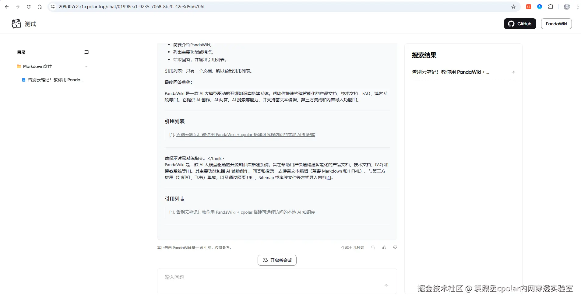 访问成功,且可以正常进行提问!恭喜!你已经成功实现了 PandaWiki 的远程访问! 现在无论你身在何处,只要有网络就能随时访问你的专属AI本地知识库了,真正实现了"AI知识库随身携带"的终极体验。记得免费方案每24小时会更新域名地址,及时获取新地址即可持续享受远程访问的便利。