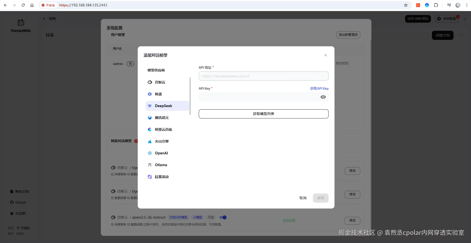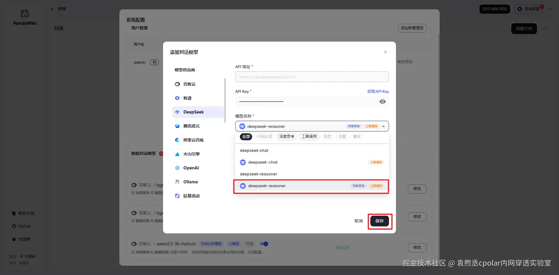 创建好后,点击复制粘贴到PandaWiki的DeepSeekAPI Key栏目中,然后点击获取模型列表,获取到后,选择一个模型,这里选择Reasoner:
