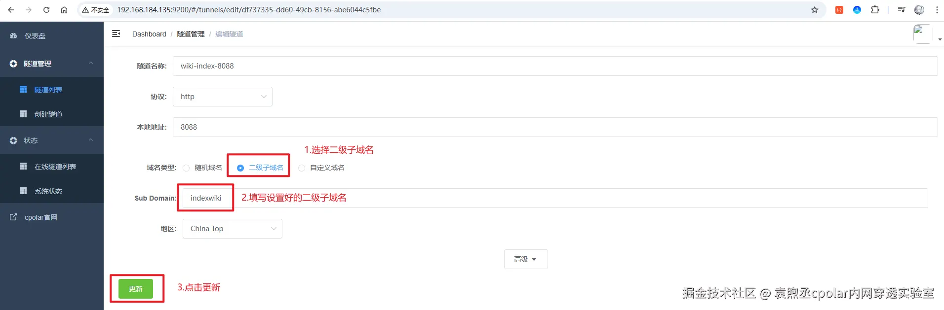 再次来到状态菜单下的在线隧道列表可以看到隧道名称为wiki-index-8088的公网地址已经变更为二级子域名+固定域名主体及后缀的形式了: