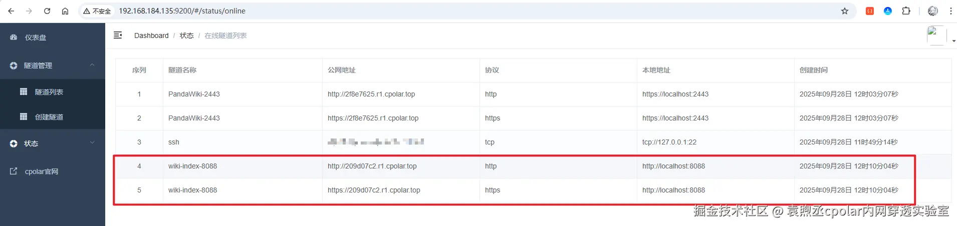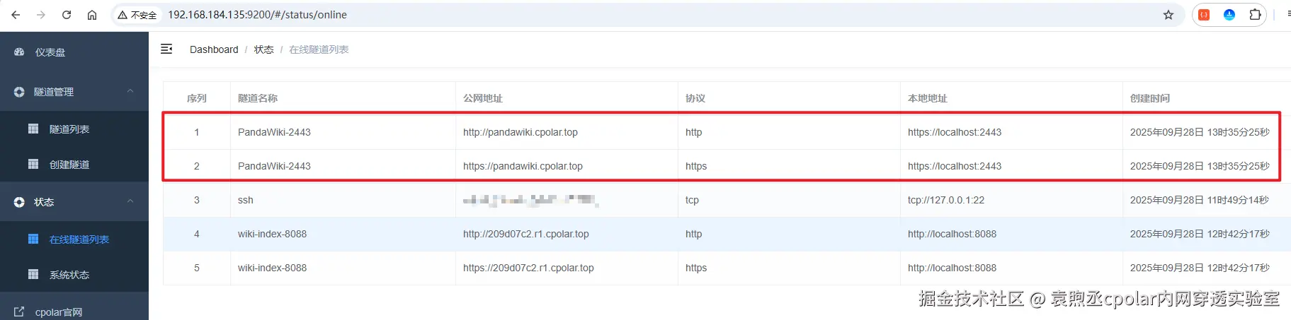 来到状态菜单下的在线隧道列表可以看到隧道名称为PandaWiki-2443的公网地址已经变更为二级子域名+固定域名主体及后缀的形式了: