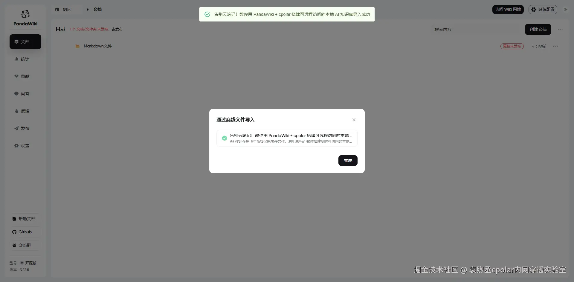 综上,通过 PandaWiki + cpolar,你可以把分散资料沉淀为可协作、可搜索、可远程访问的本地 AI 知识库,既保障隐私与稳定,又显著提升检索与创作效率。
