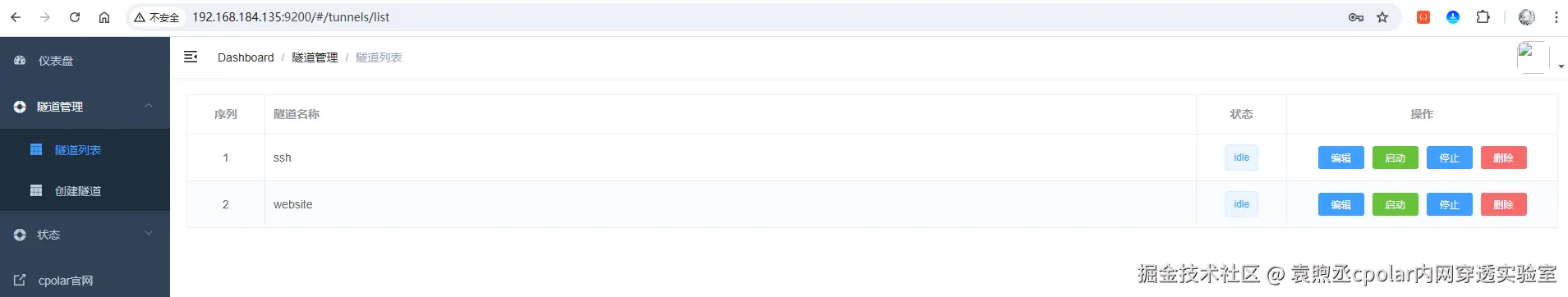 点击左侧菜单栏的隧道管理,展开进入隧道列表页面,页面下默认会有 2 个隧道:
