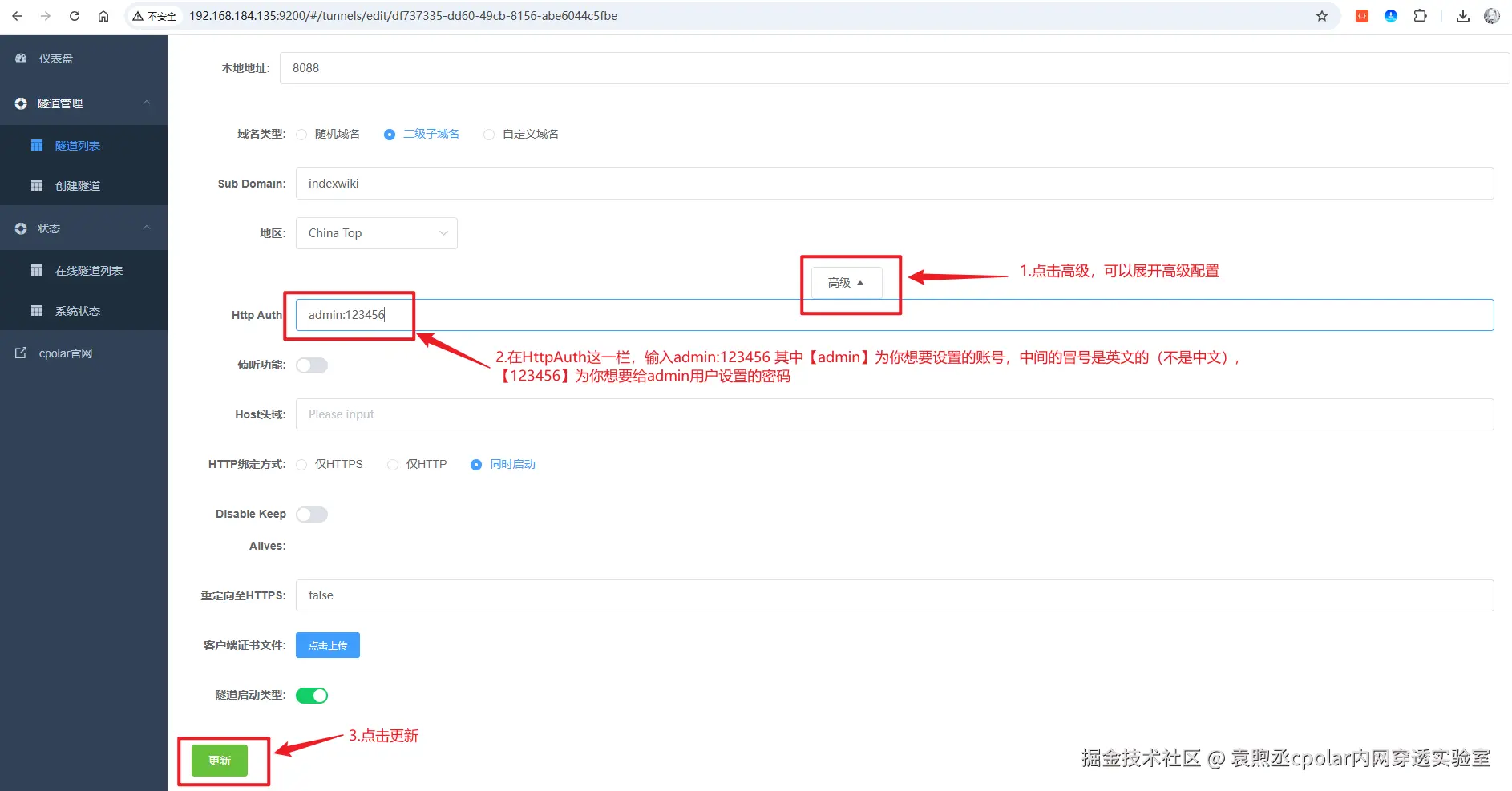 首先,打开cpolar管理界面,进入隧道管理 → 隧道列表,找到wiki-index-8088隧道,点击编辑按钮: