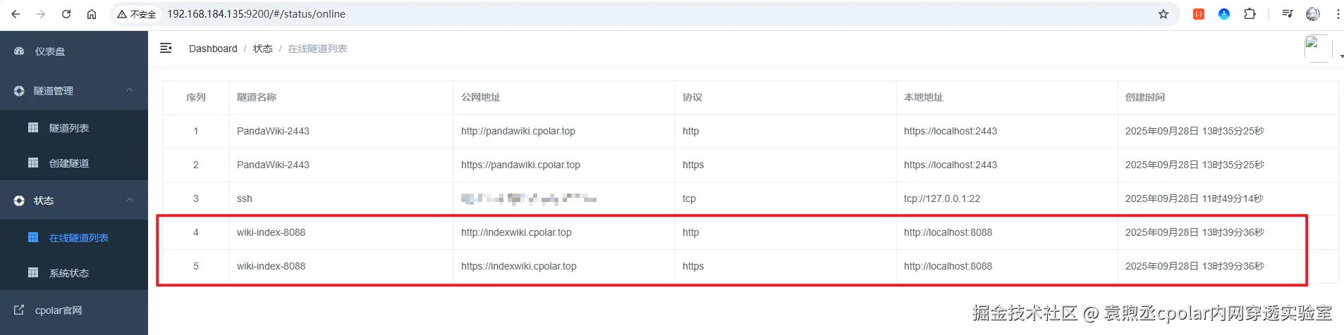 创建成功后,来到在线隧道列表里面可以看到名称为wiki-index-8088隧道的两条记录信息,一条协议为http,另一条协议为https::