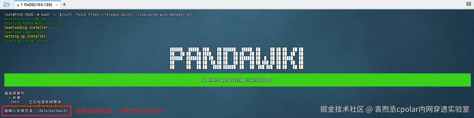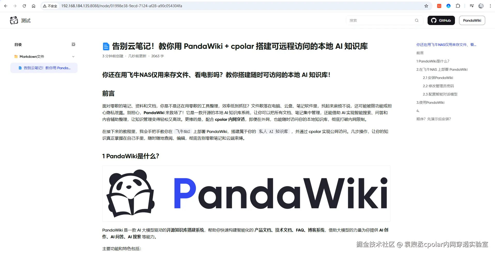本文从零带你在飞牛NAS上部署并用好 PandaWiki:完成安装、初始配置与模型接入(以 DeepSeek 为例),导入与发布文档,体验 AI 检索和问答;随后通过 cpolar 打通公网访问,从随机域名到固定二级子域名、启用 HTTPS、设置开机自启与访问授权,让本地 AI 知识库实现"随时随地、安全可达"。